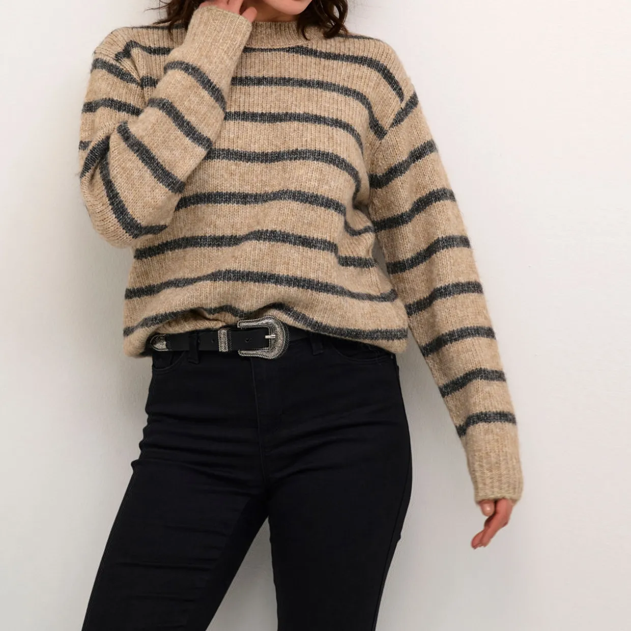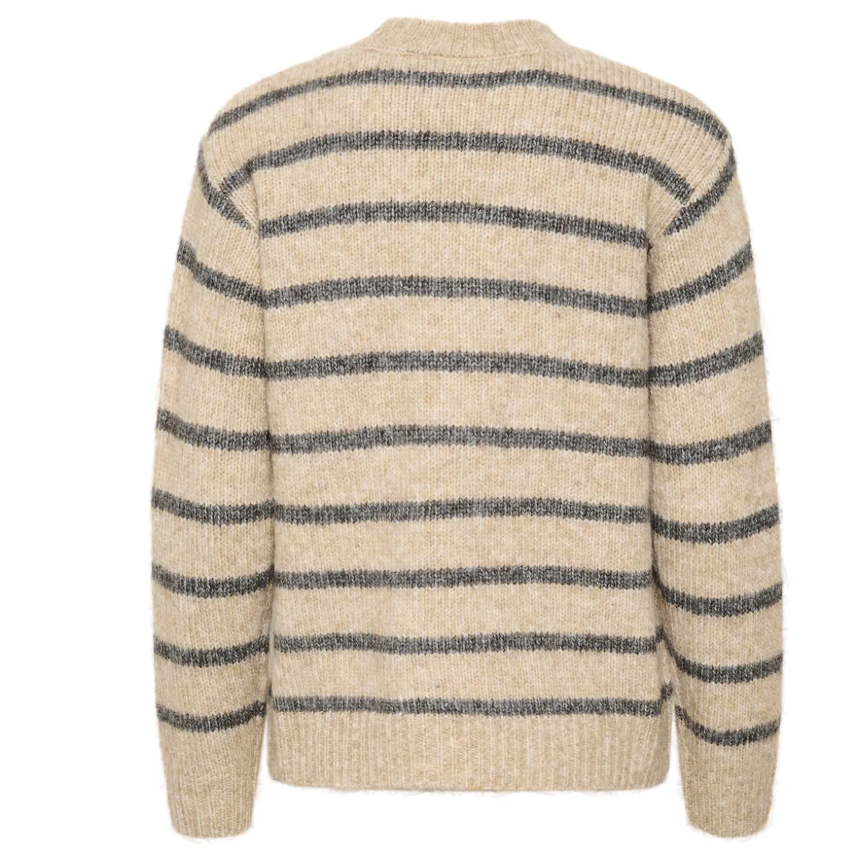 - Crew neckline, soft knit fabric, horizontal striped design, long sleeves, ribbed trims