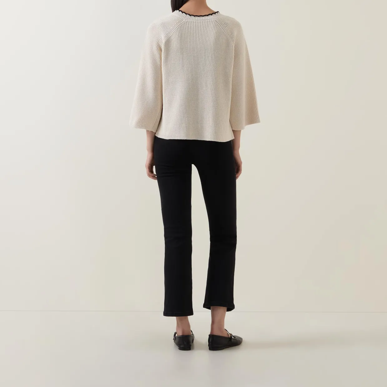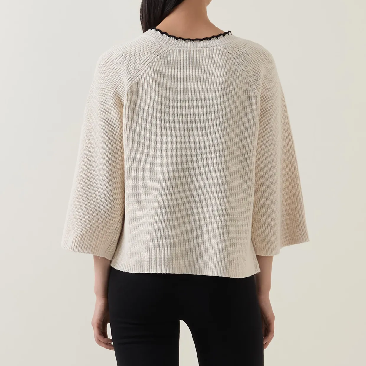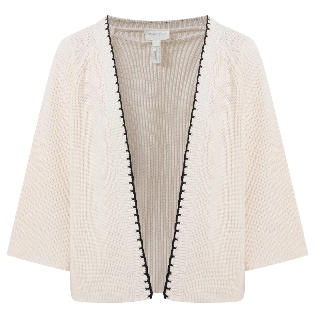 - Contrast trim, cropped sleeves, open front, straight hemline