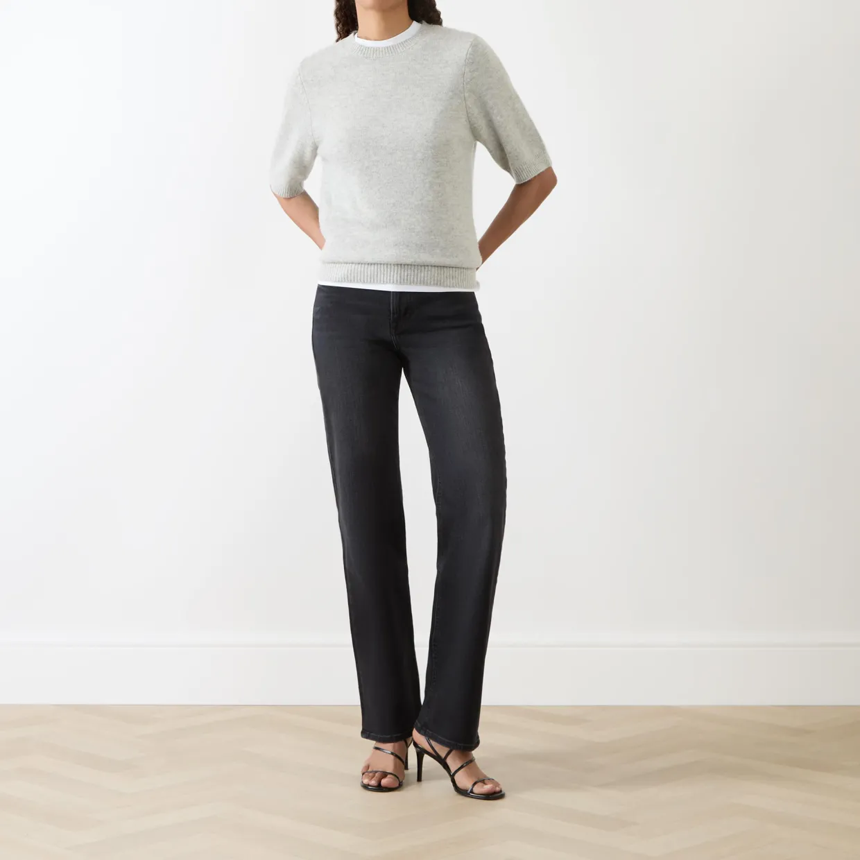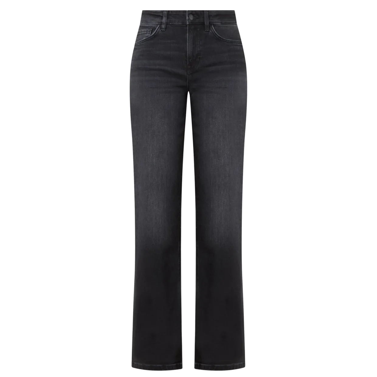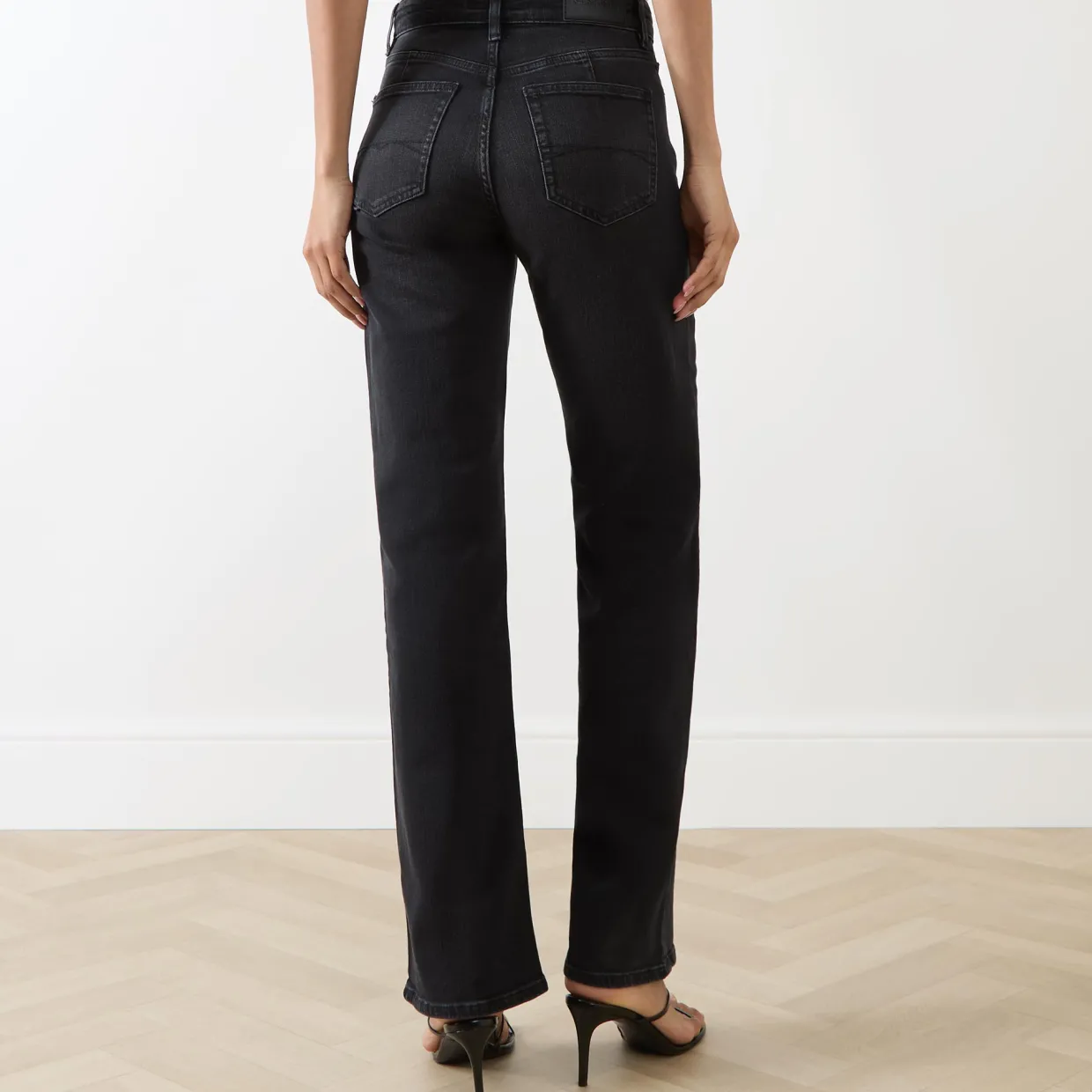 - High-rise, straight leg, full length, belt loops, concealed fly and button fastening, five-pocket styling, clean hems, tonal stitching, dark wash finish