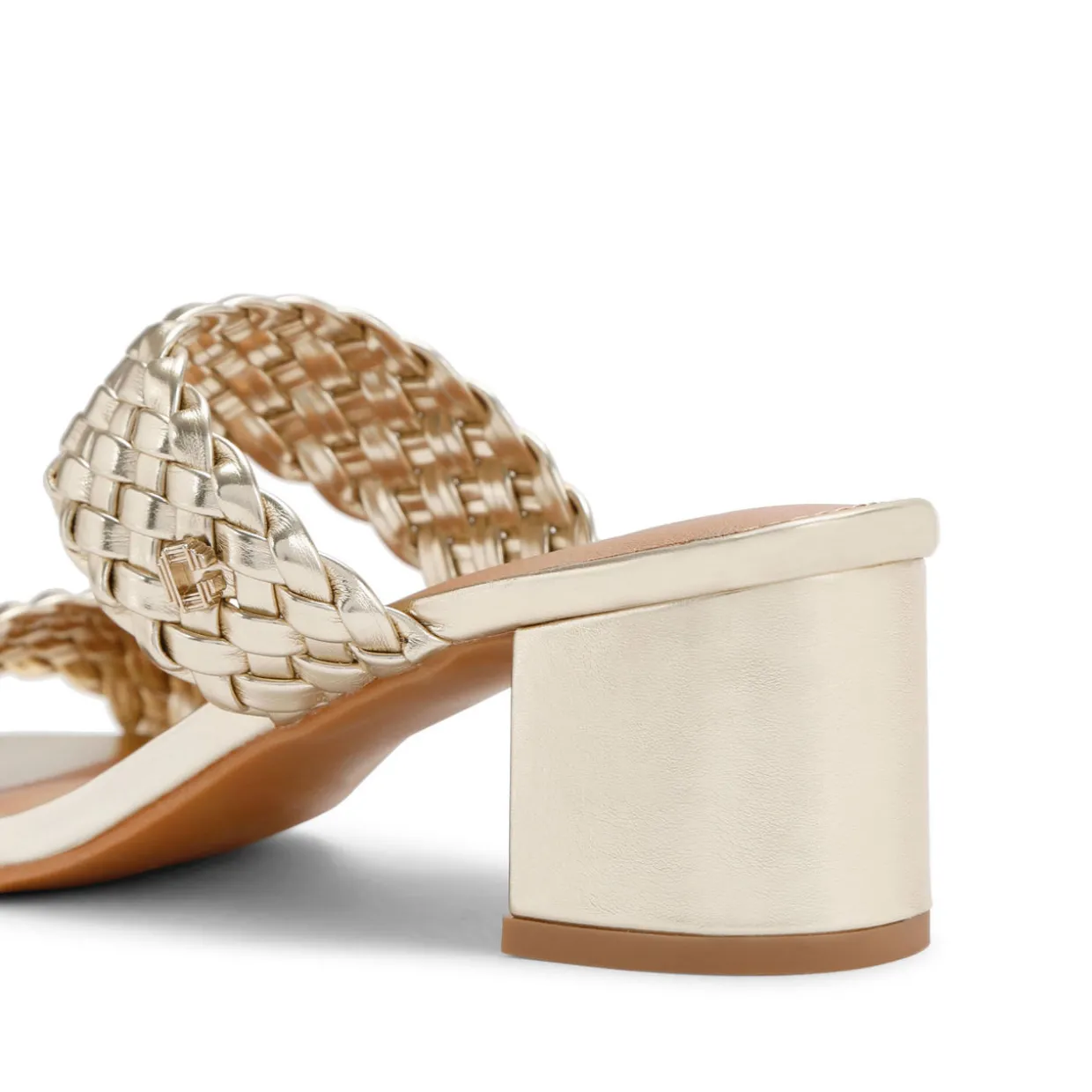 - Backless silhouette, slip-on style, two woven foot straps, gold-tone Icon C stud, round open toe, block heel, ‘All Day Long’ technology