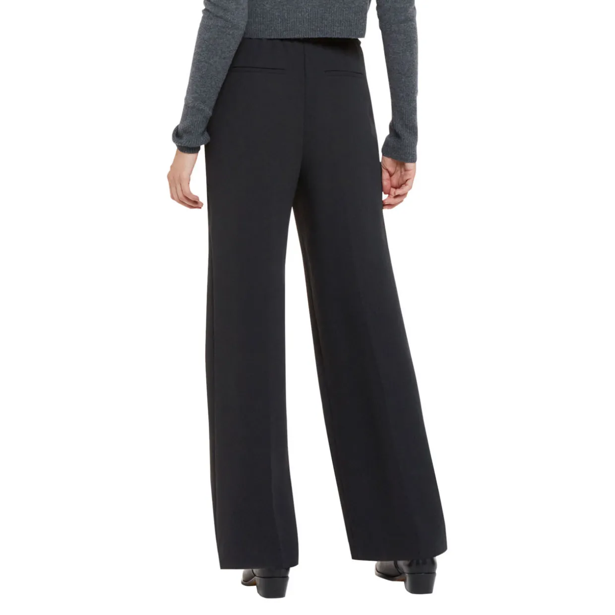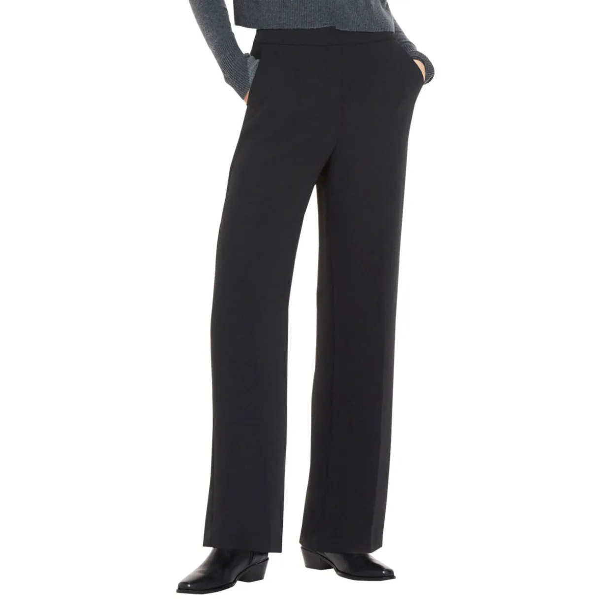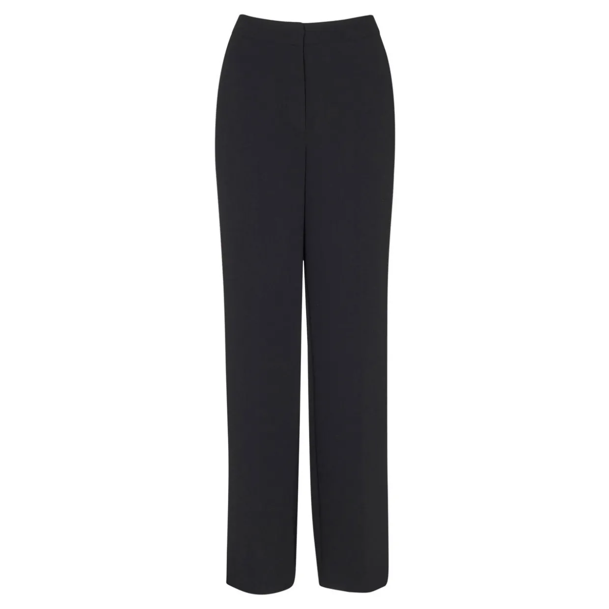 - Concealed zip-fly and button closure, four-pocket design, pressed creases, smooth fabric