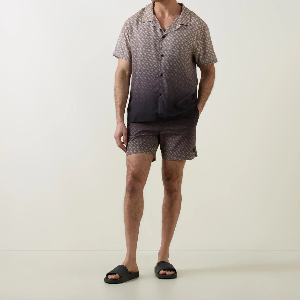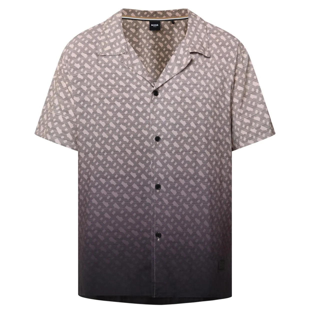 - Camp collar, short sleeves, front button fastening, straight hem, logo tag, all over printed design, gradient finish, lightweight