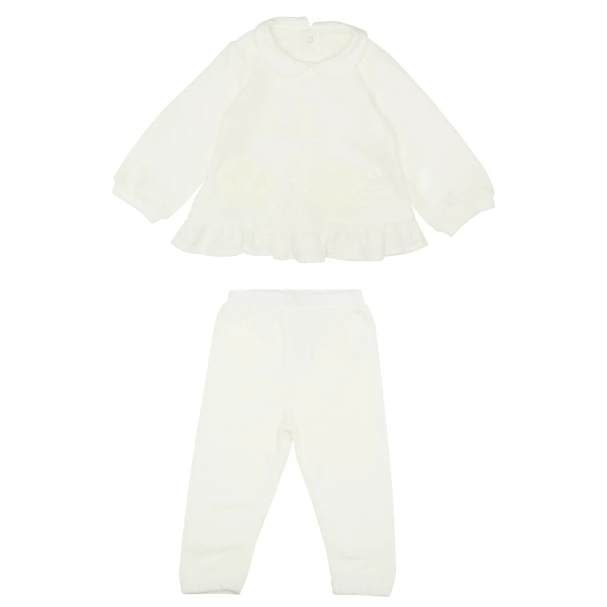 - Sweatshirt: Long sleeves, Peter Pan collar, snap-button fastenings, ruffle hemline, smooth velour fabric. Sweatpants: Elasticated waistband, smooth velour fabric