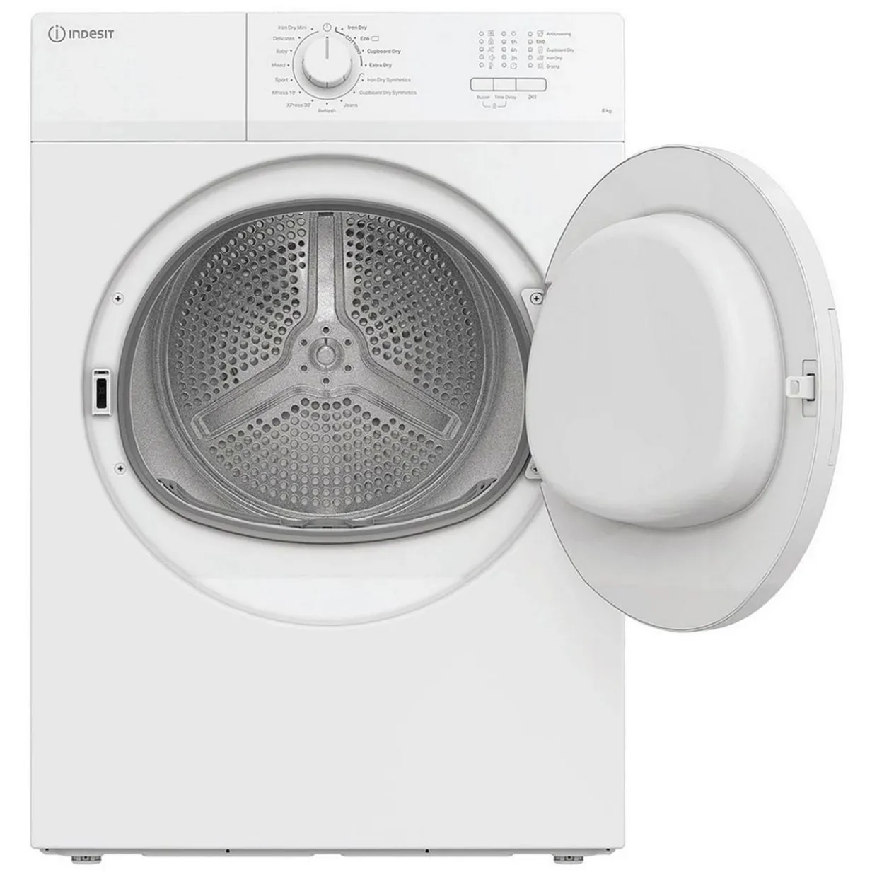 This Indesit Vented Tumble Dryer with a large 8kg drum capacity comes in pristine white to suit any kitchen and is rated C for energy efficiency, it features an LED display and a single dial for selecting one of 15 cycles. Get your outfits ready to wear without delay, thanks to two Xpress Cycles that will dry your clothes in either 10 or 30 minutes. When you’re in a rush, the Iron Dry Mini option dries two shirts ready for ironing, so you can be out the door in no time.