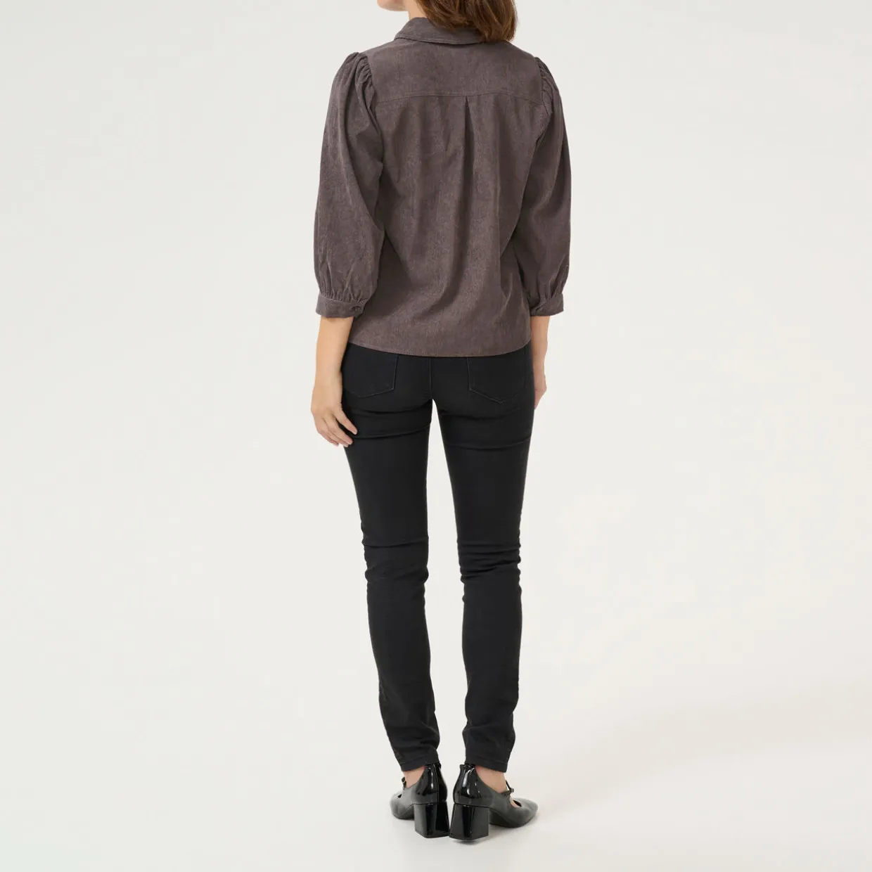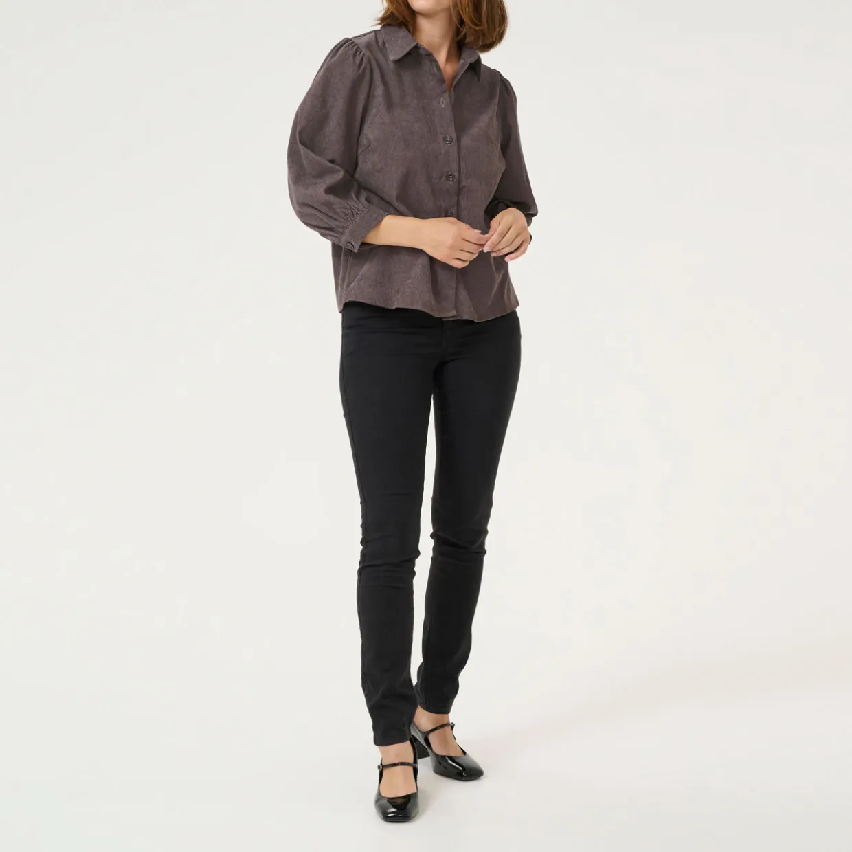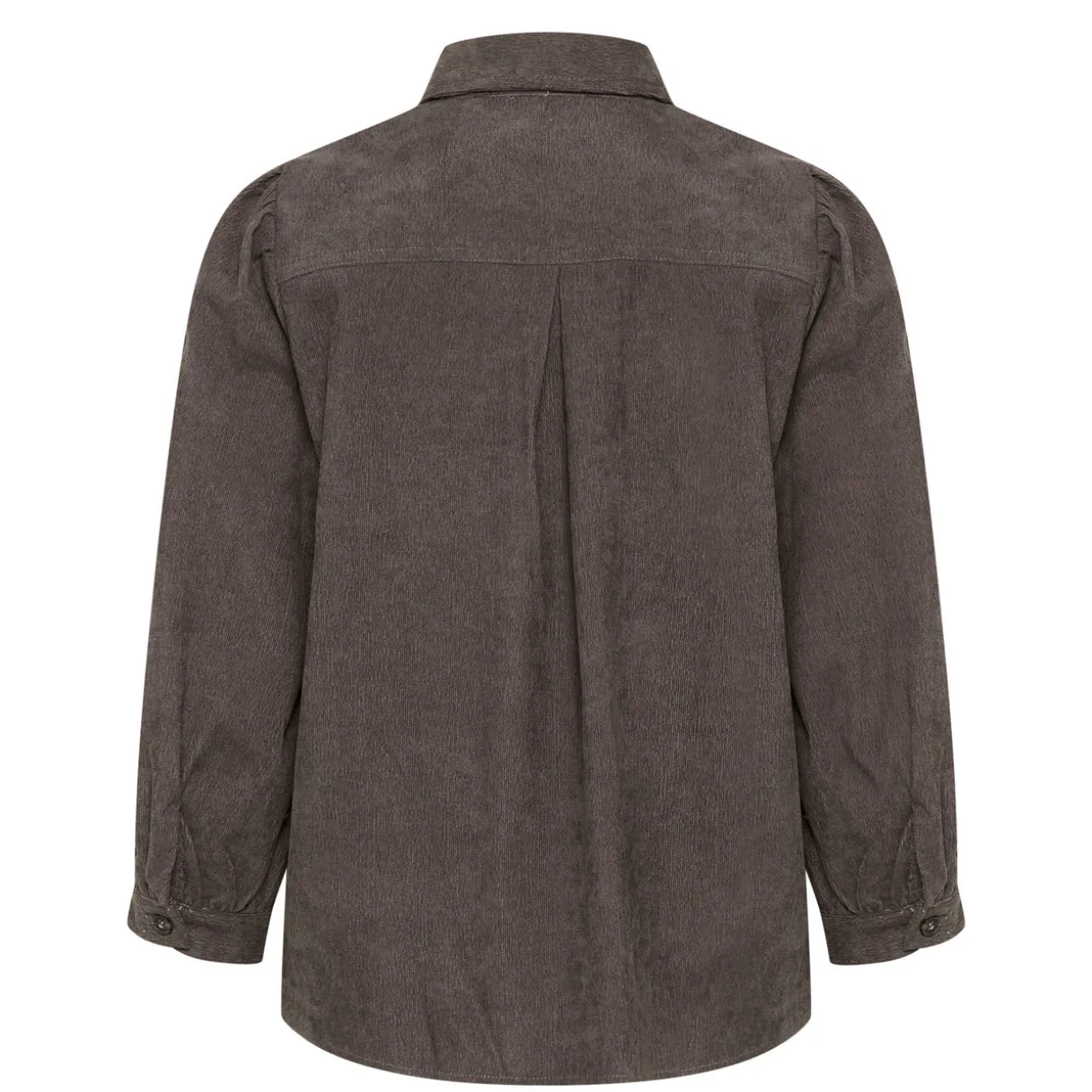 - Pointed collar, full button fastening, three-quarter-length puff sleeves, buttoned cuffs, straight hemline, corduroy finish