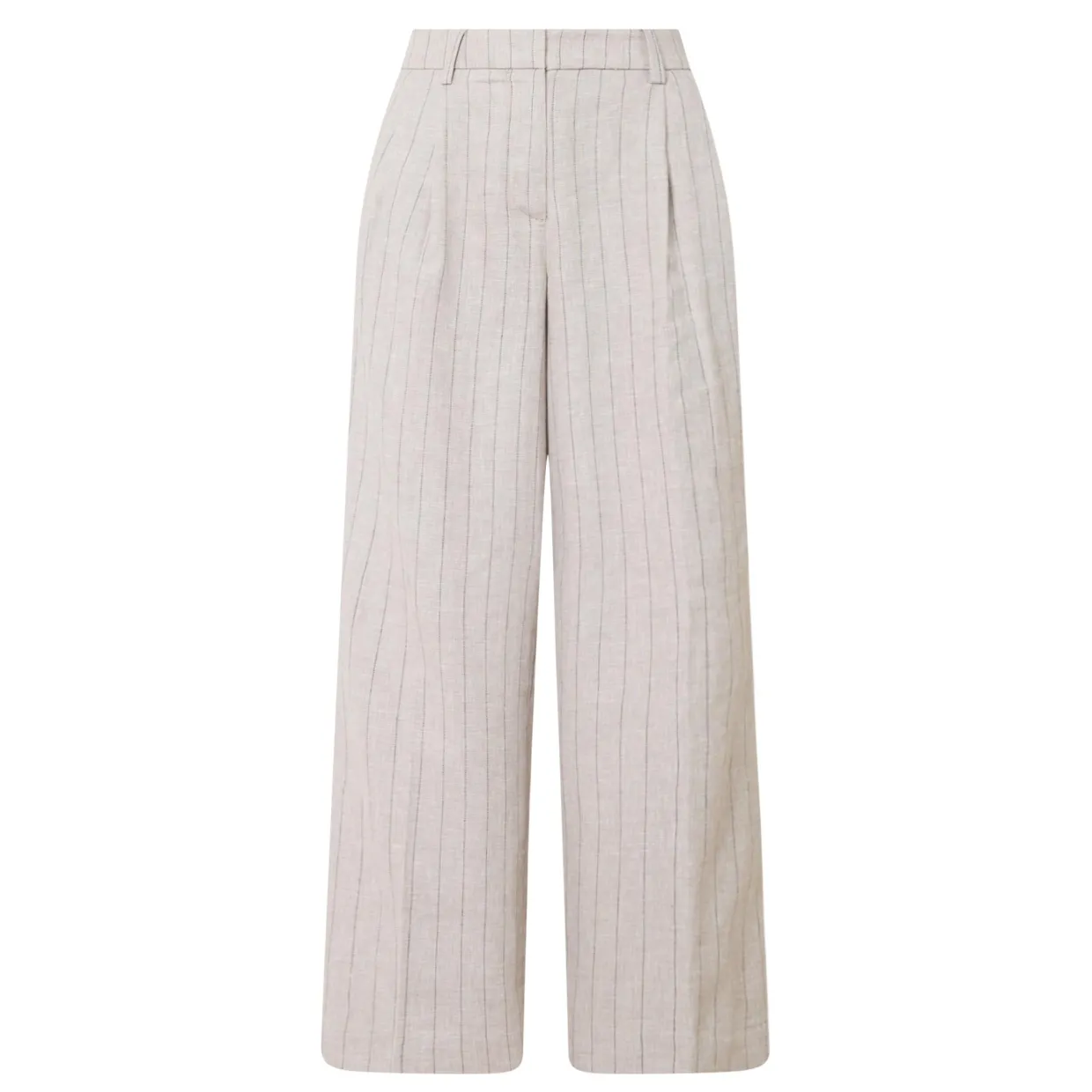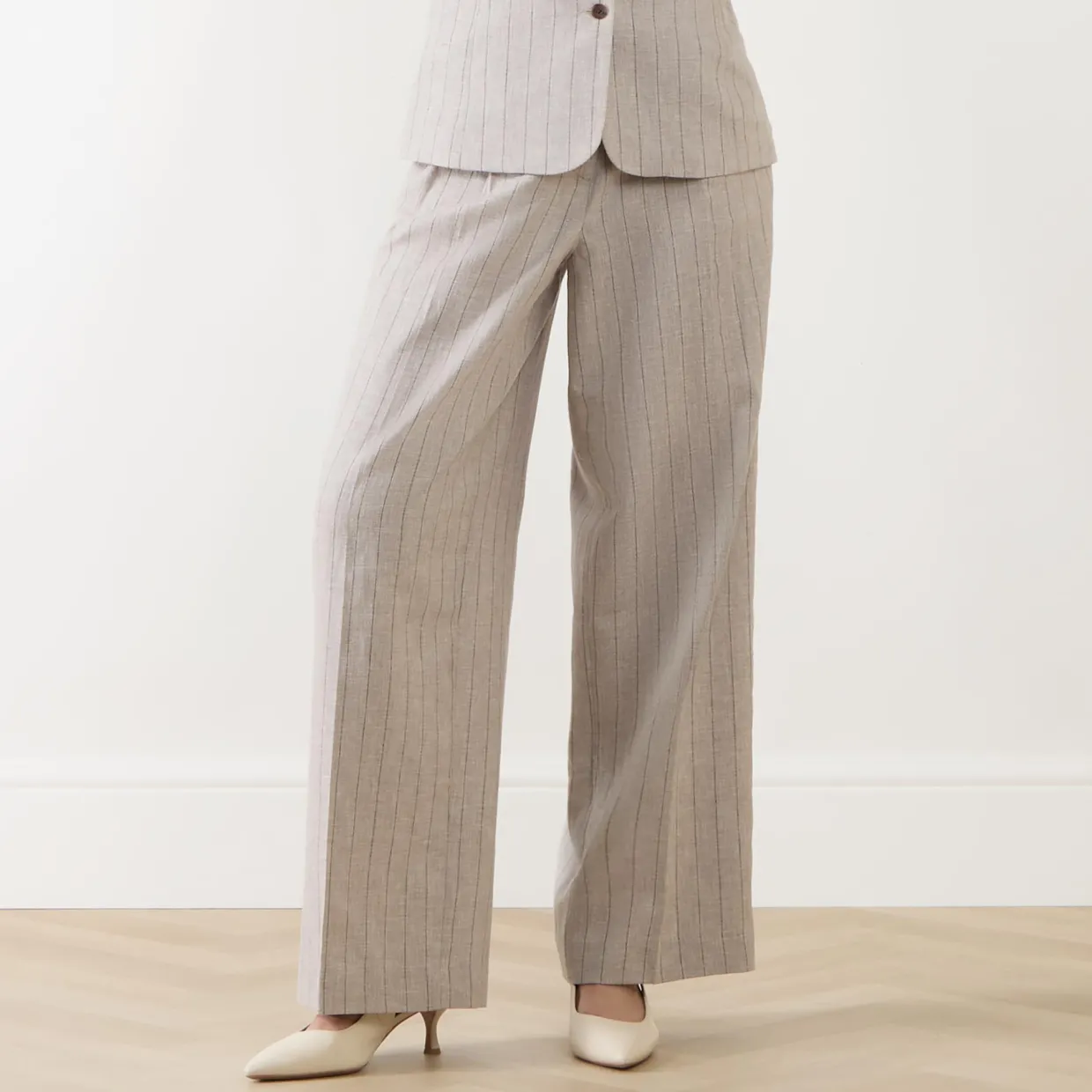 - High-rise, wide leg, full length, belt loops, concealed fly with hook and bar fastening, front pleats, two side seam pockets, clean hems, pinstripe pattern