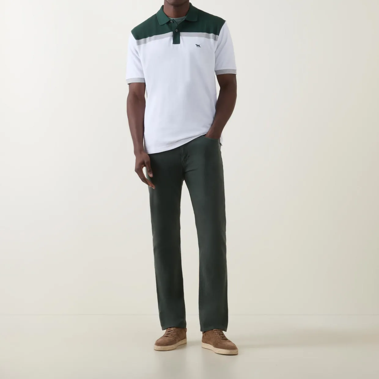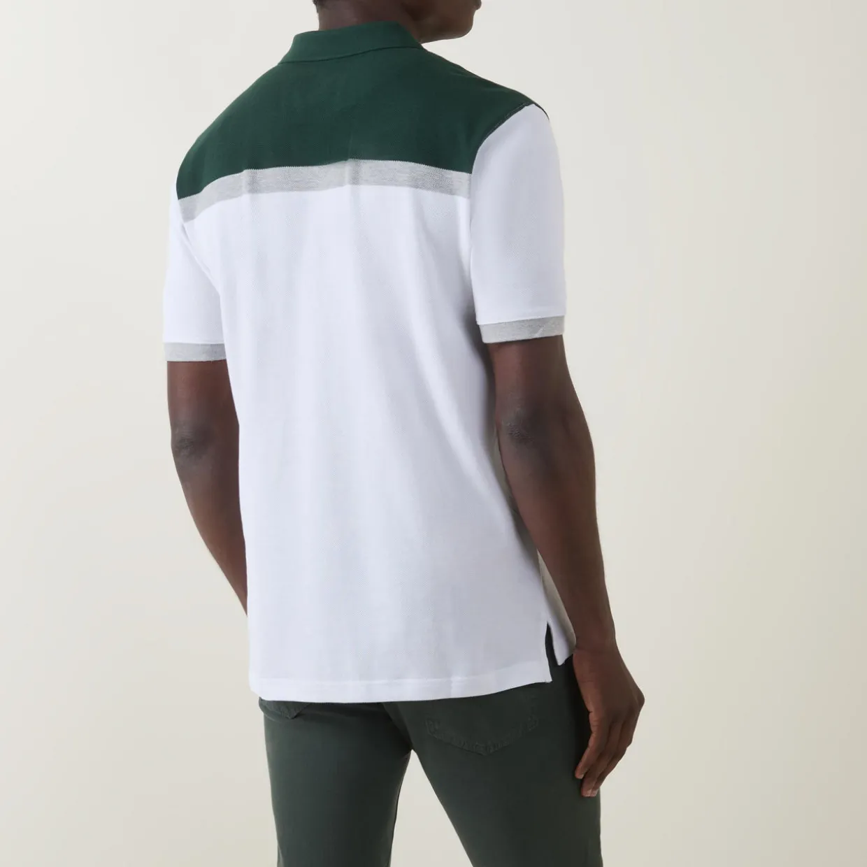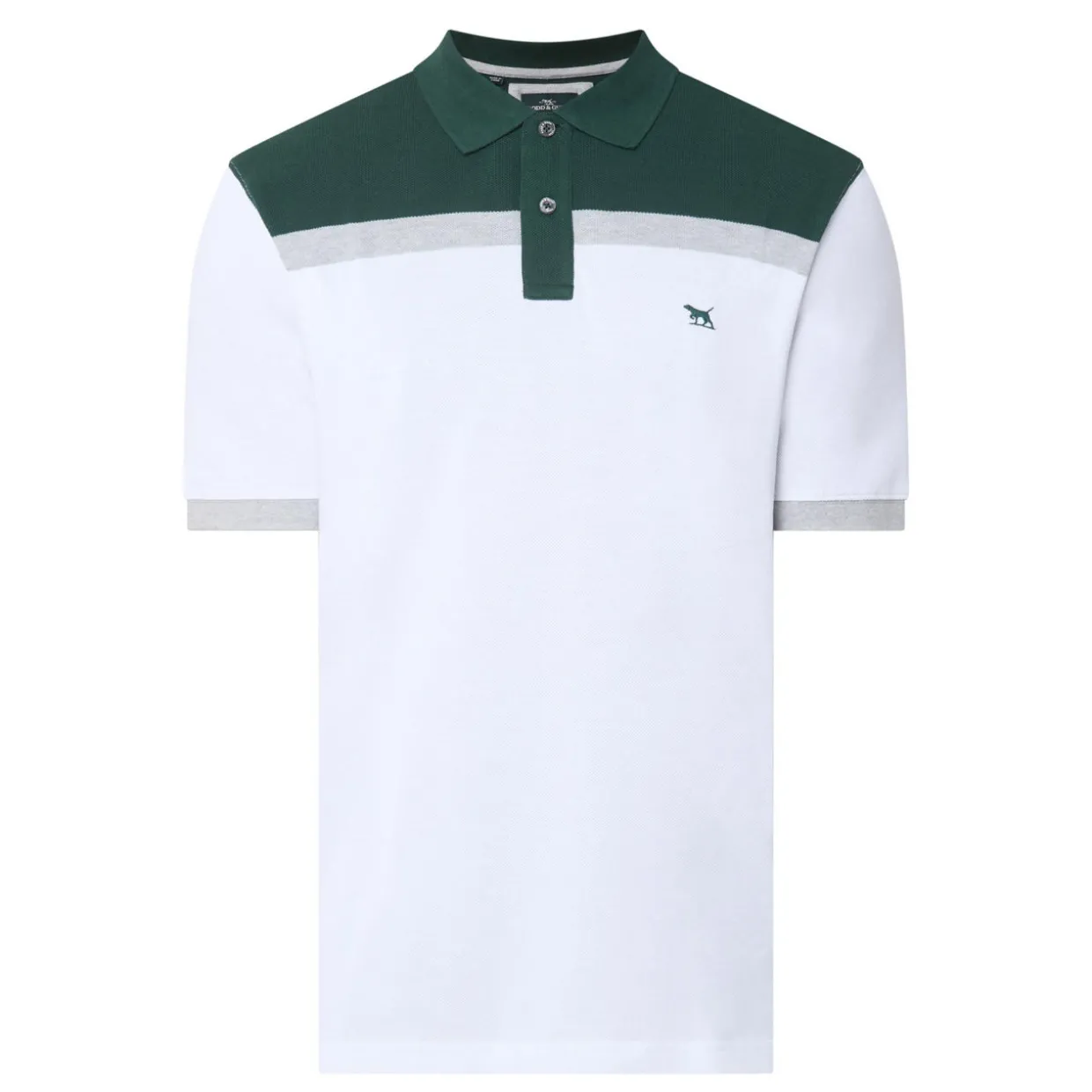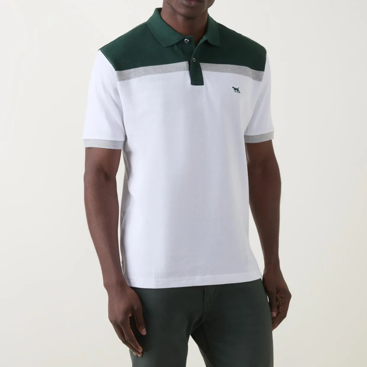 - Flat knit collar and cuffs, button fastening, short sleeves, straight hemline, split side seams, breathable piqué fabric, colour block pattern, embroidered pointer dog logo detail