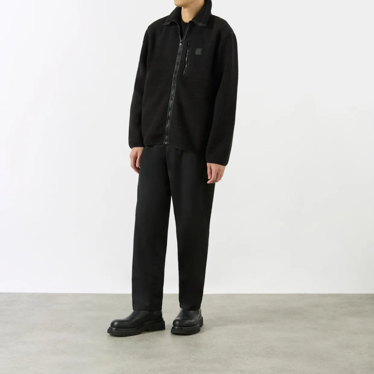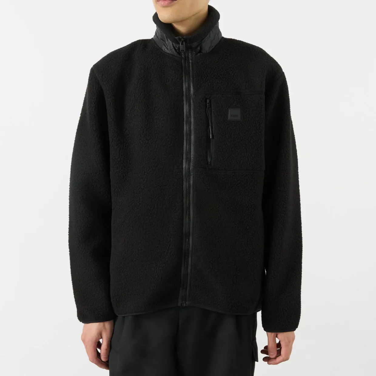 - Stand collar, dropped shoulders, long sleeves, front zip fastening, one chest pocket with vertical zip fastening, two side entry pockets, straight hem, bound trims, heavyweight fleece design, ripstop panel detailing, logo badge