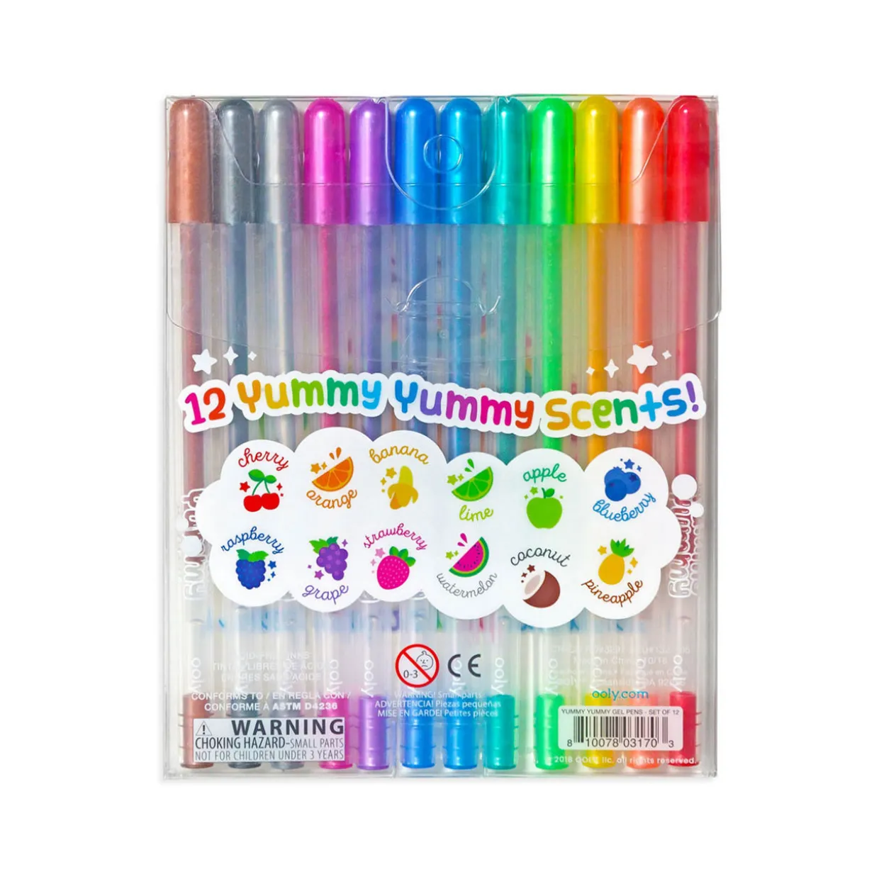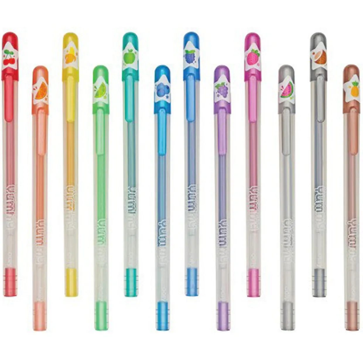 - Set of twelve, glittery gel pens, assorted colours and fruity scents