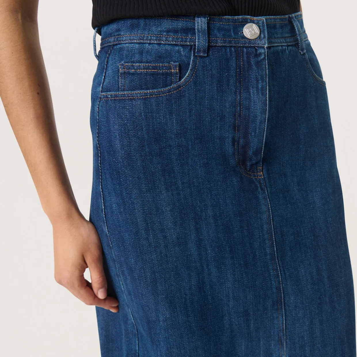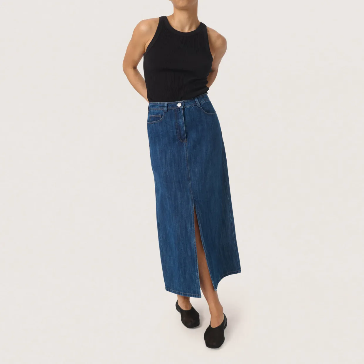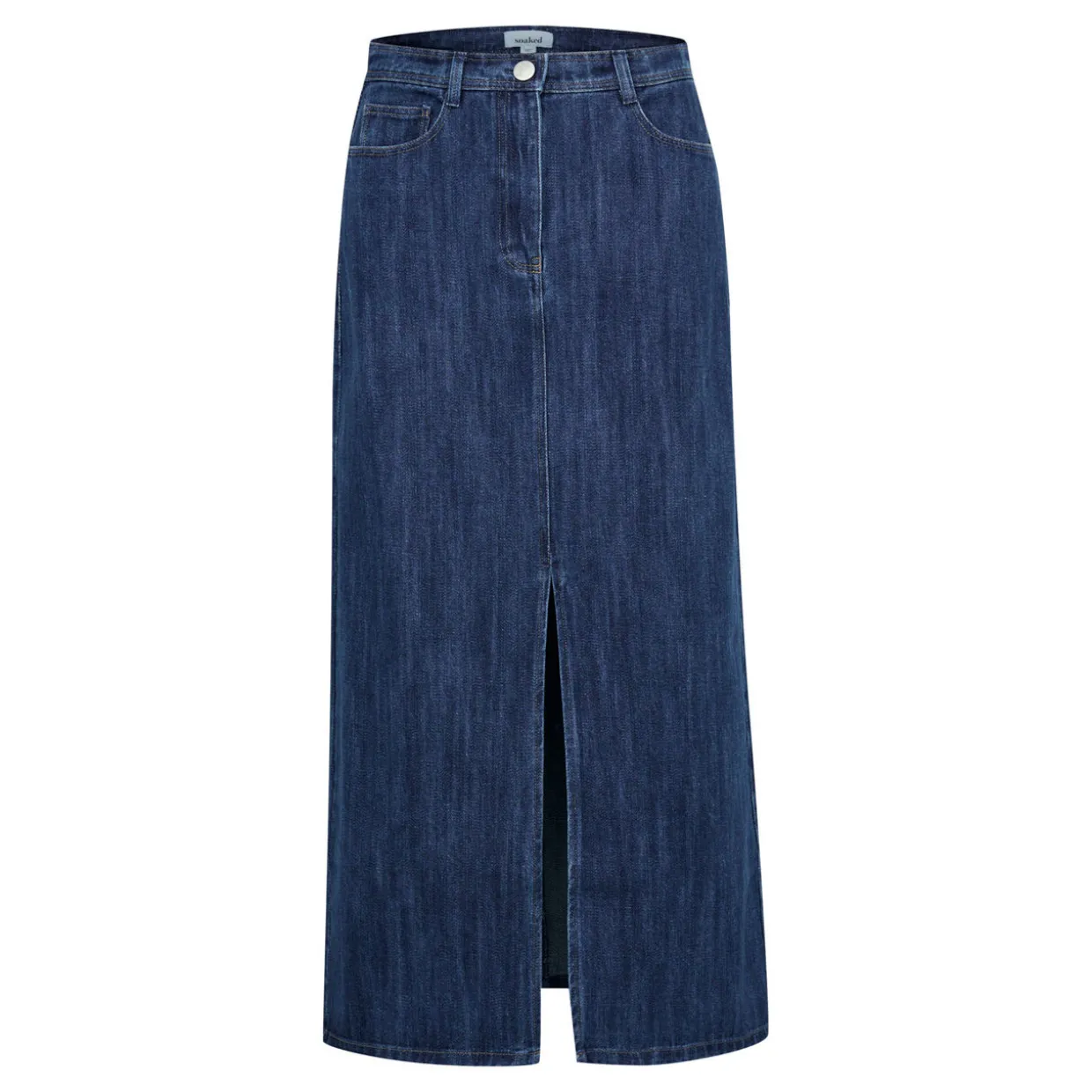 - Mid-rise, belt loops, concealed fly and button fastening, five-pocket styling, A-line silhouette, front slit, midi length, mid wash finish