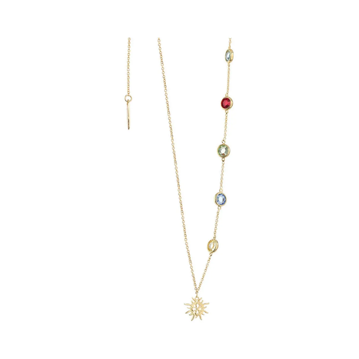 - Amy Huberman collection, sun charm representing power, multi-coloured cubic zirconia stone settings, 14k gold-plated with a protective anti-tarnish layer, adjustable cable chain, slider mechanism