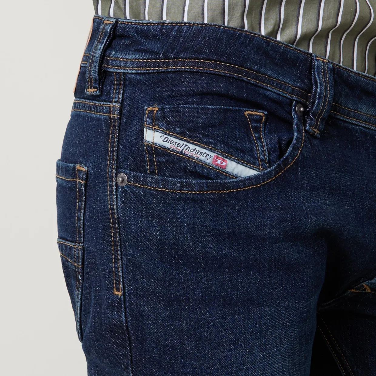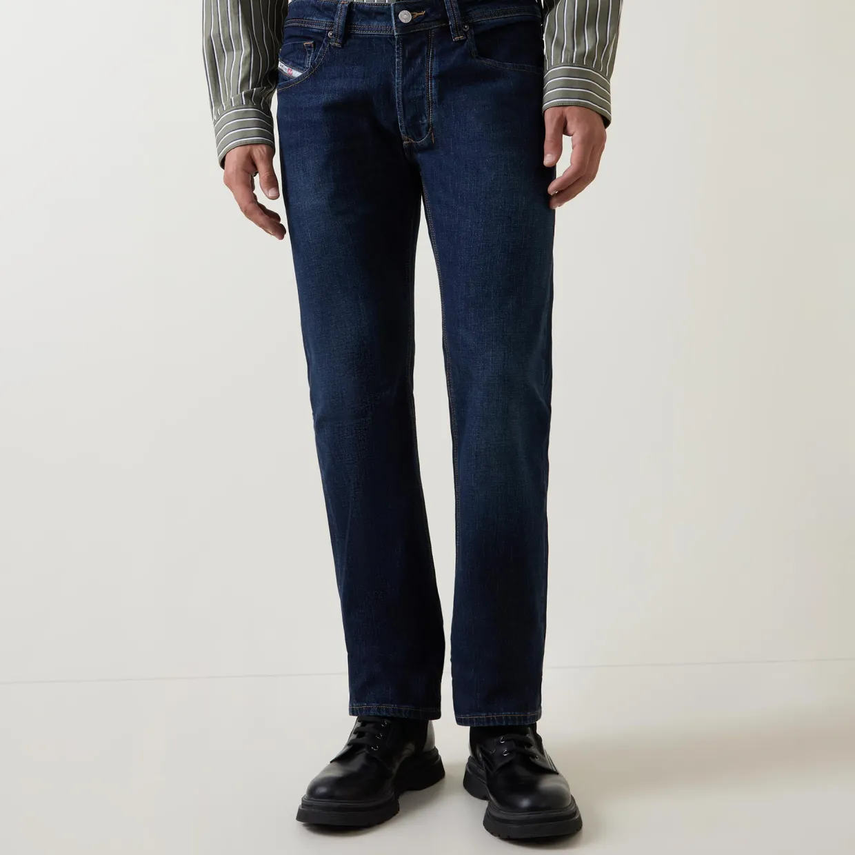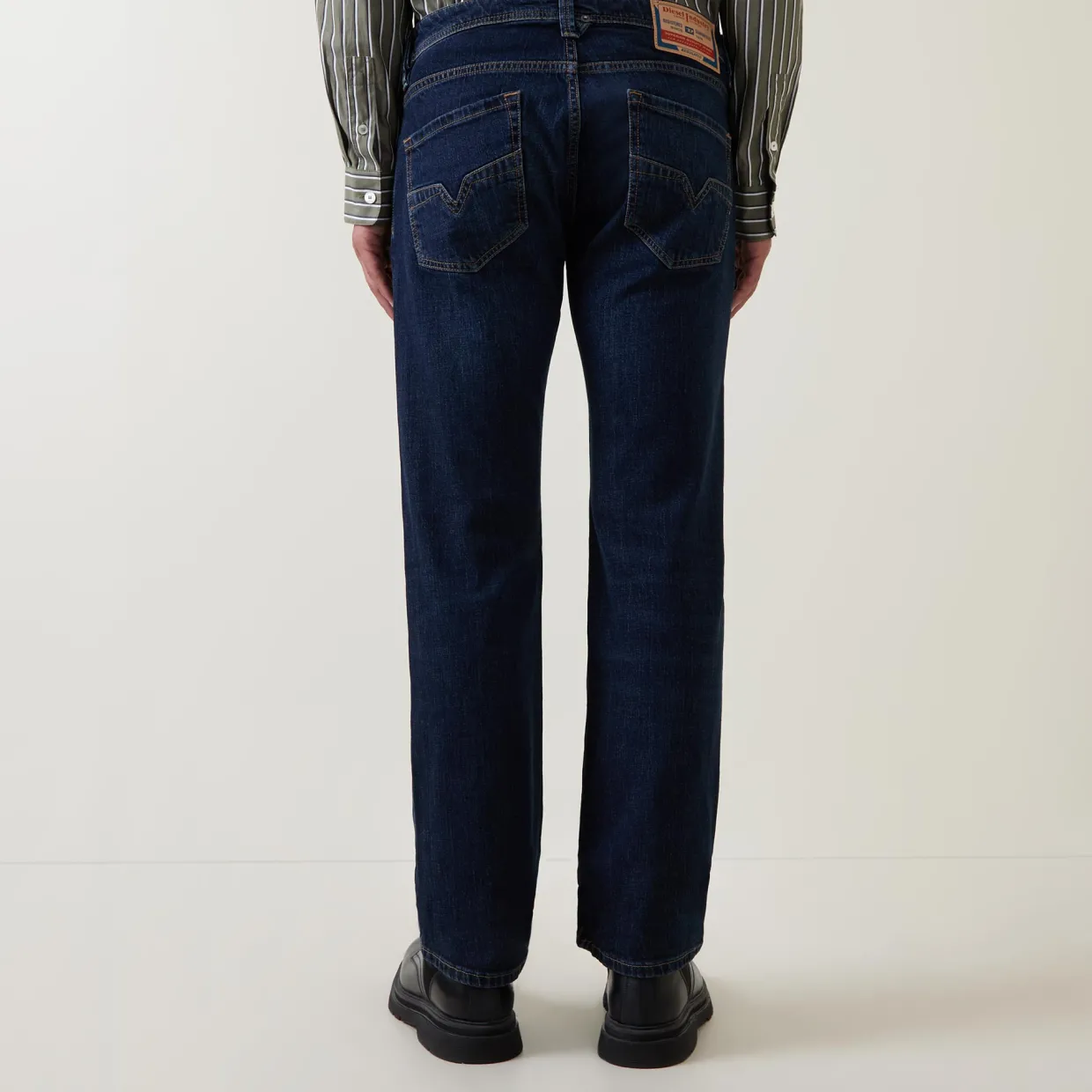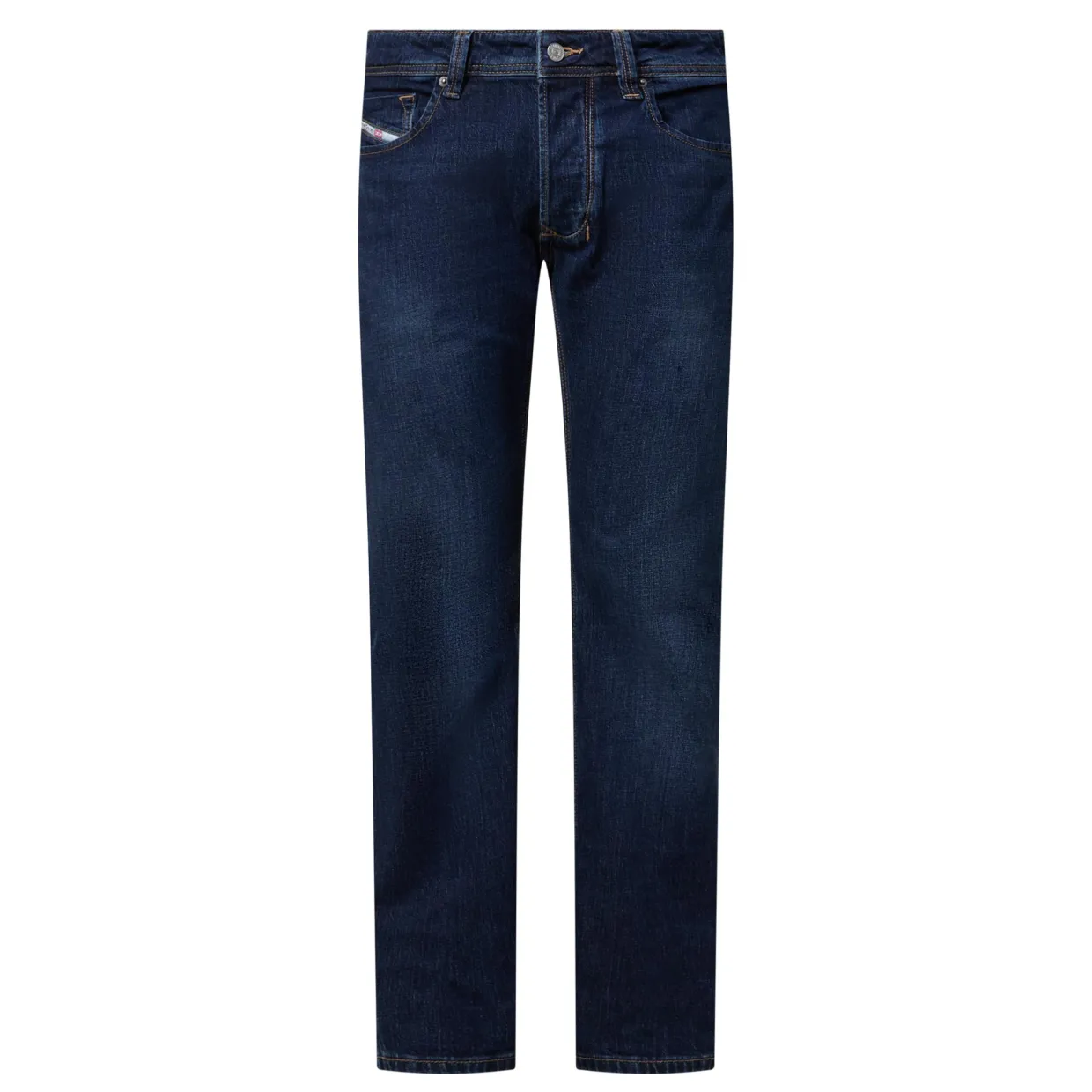- Zip-fly and button fastening, belt loops, five-pocket design, tonal stitching, rear logo patch, whiskering and faded detailing, mid-rise, straight-cut leg, smooth denim finish