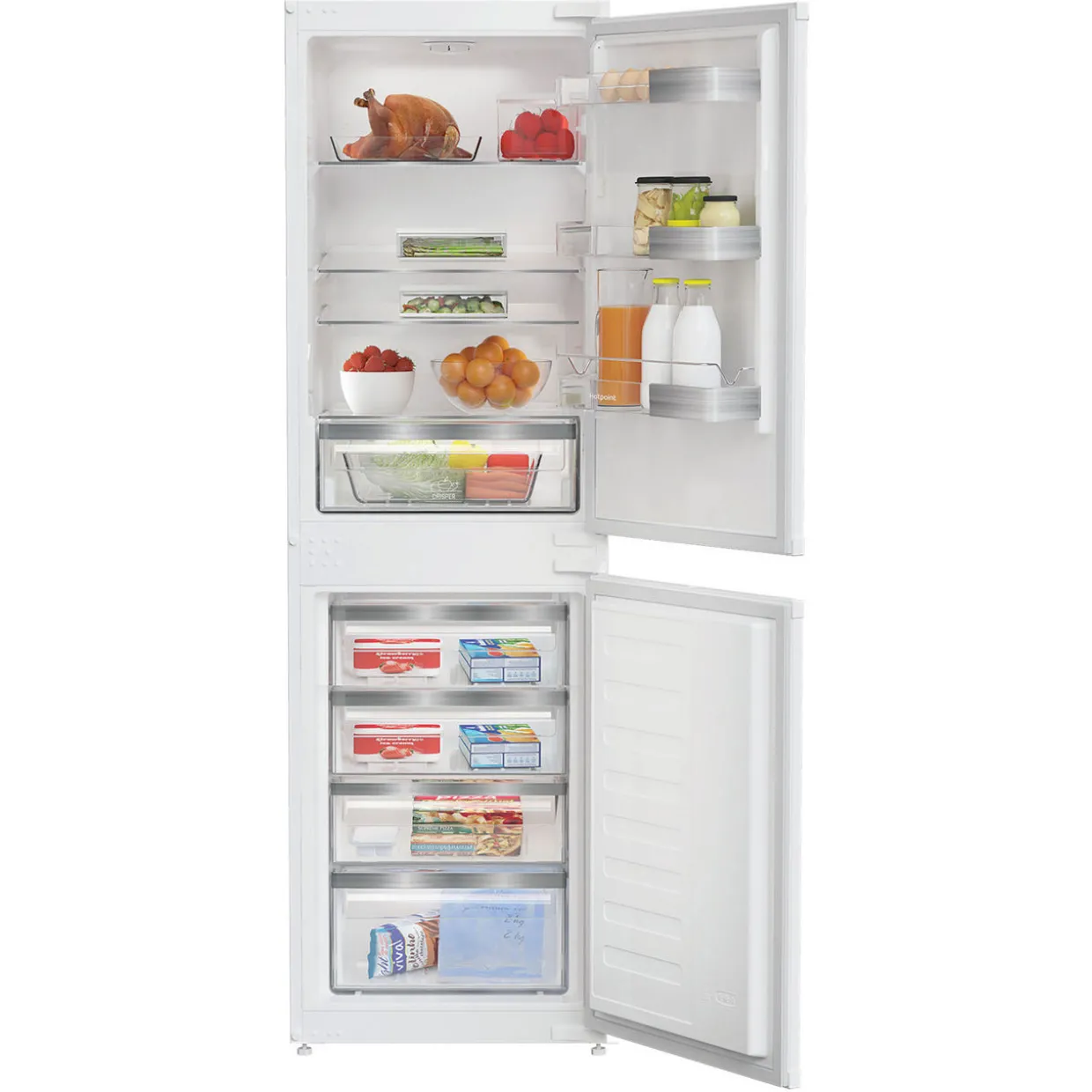 The Hotpoint HPKH1262B4UK integrated 50/50 fridge freezer is designed to keep your groceries fresher for longer while seamlessly fitting into your kitchen. With a 254L capacity, it holds up to 14 shopping bags, offering plenty of storage. No Frost technology prevents ice build-up, eliminating the need for defrosting, while the Fresh Zone drawer keeps fruit and vegetables crisp for longer.