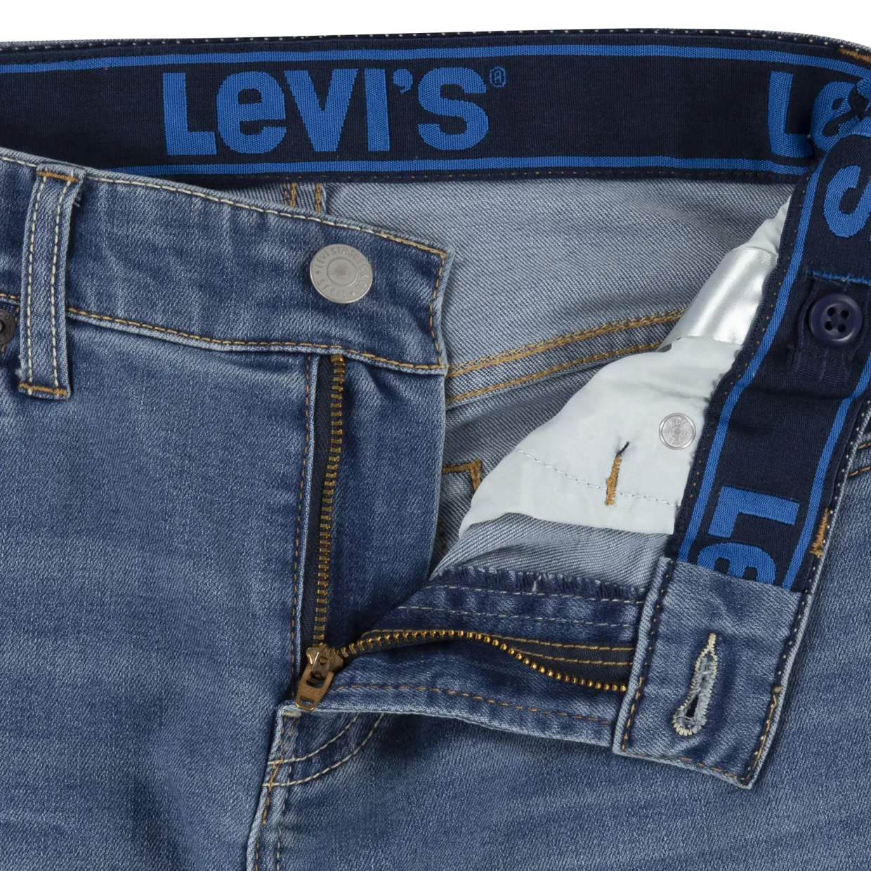 - Tapered silhouette, performance denim to wick away sweat, helps regulate body temperature, five-pocket design, adjustable waistband, belt loops, brand logo patch, whiskering, fly and button fastening, mid wash