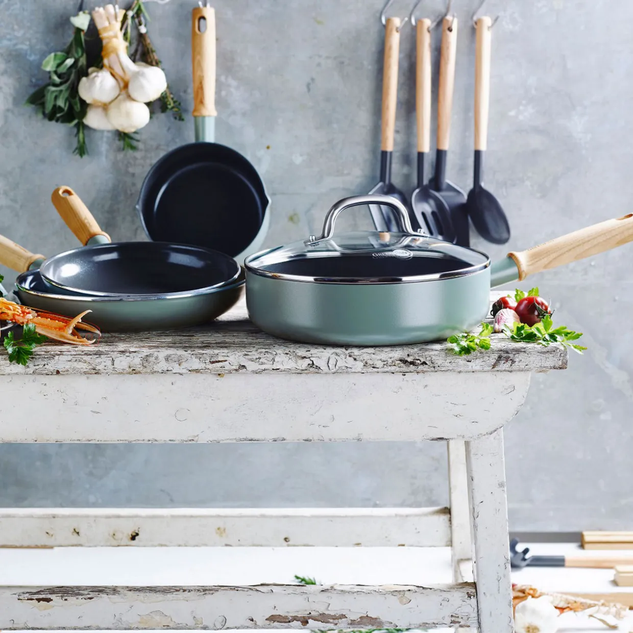 - Set includes: 1 x saucepan with lid, 1 x lipped saucepan, 2 x frying pans, 1 x slotted turner, 1 x turner, 1 x slotted spoon, 1 x serving spoon