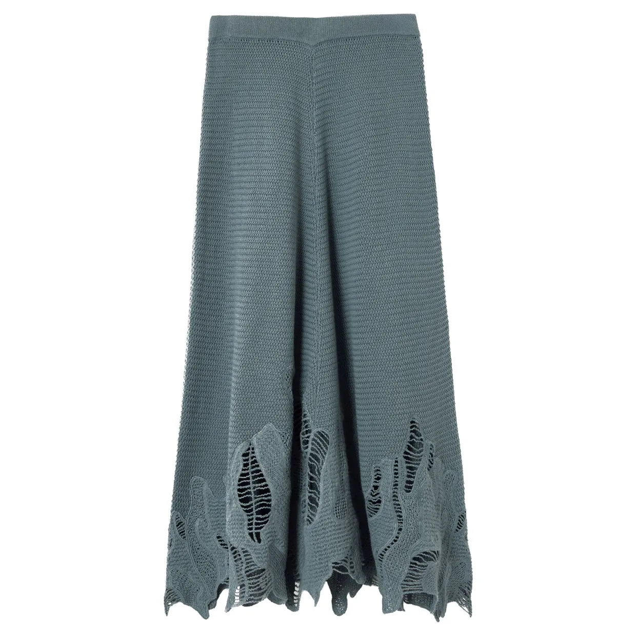 - High-rise, A-line silhouette, lace detailing, midi length, knit construction