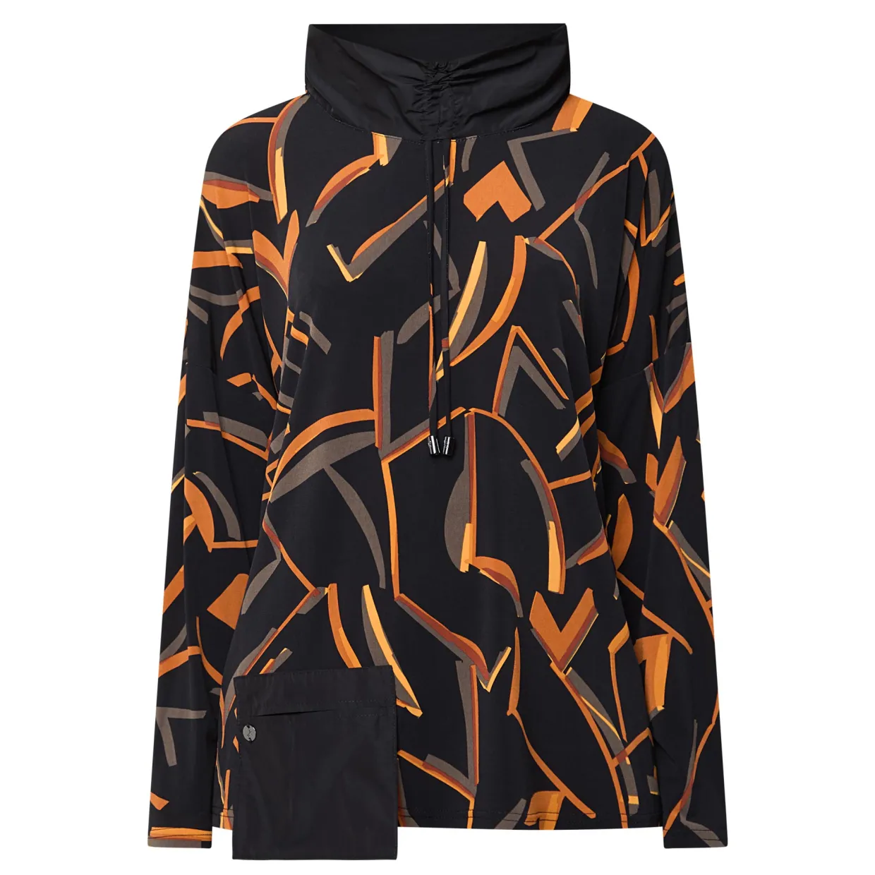 - Funnel neck with flat drawstring fastening, dropped shoulders, long sleeves, one patch pocket, straight hem, abstract print pattern, silver-tone hardware