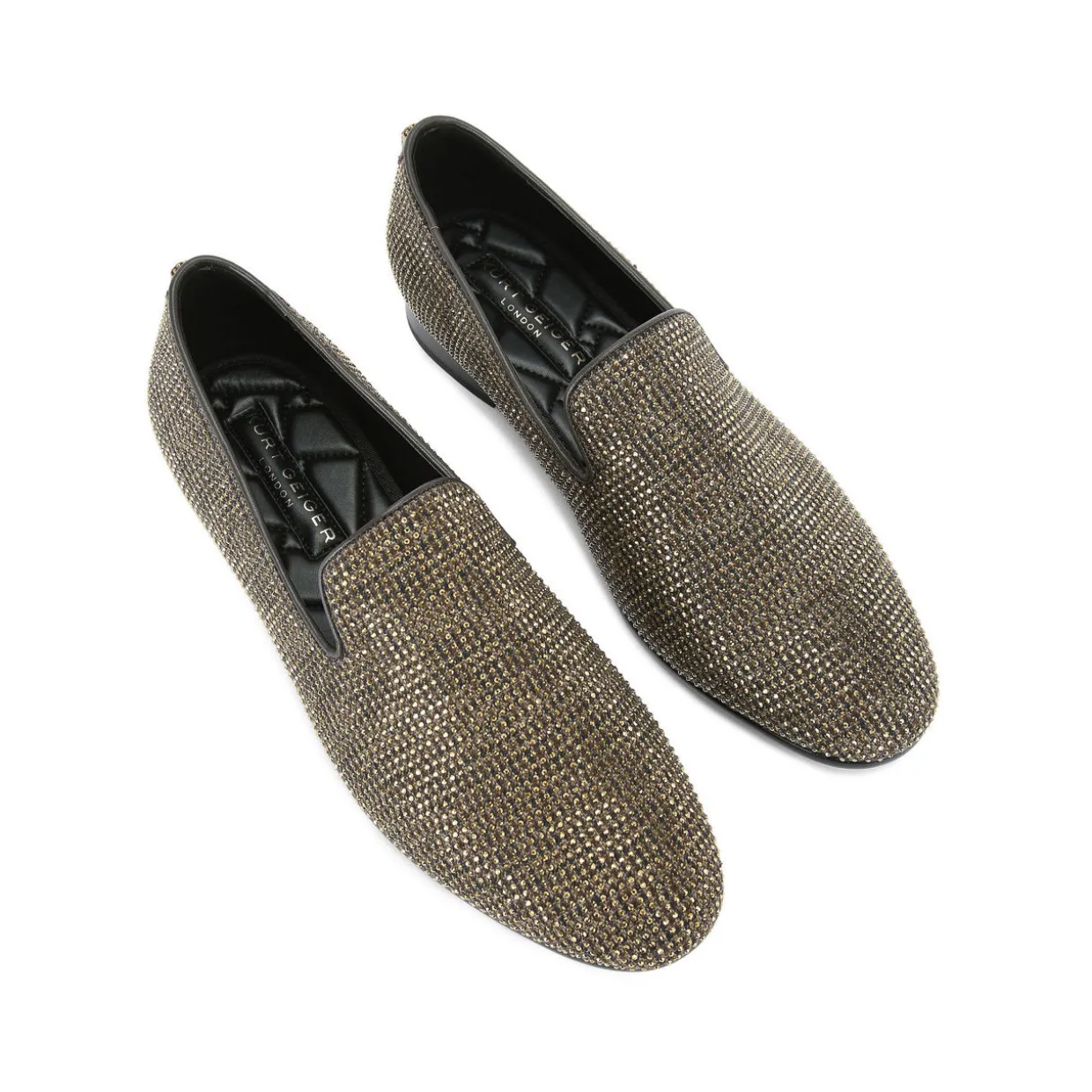 - Slip-on style, round toe, quilted and padded footbed, antique brass eagle head hardware at the heel, houndstooth fabric upper, all-over embellished detailing