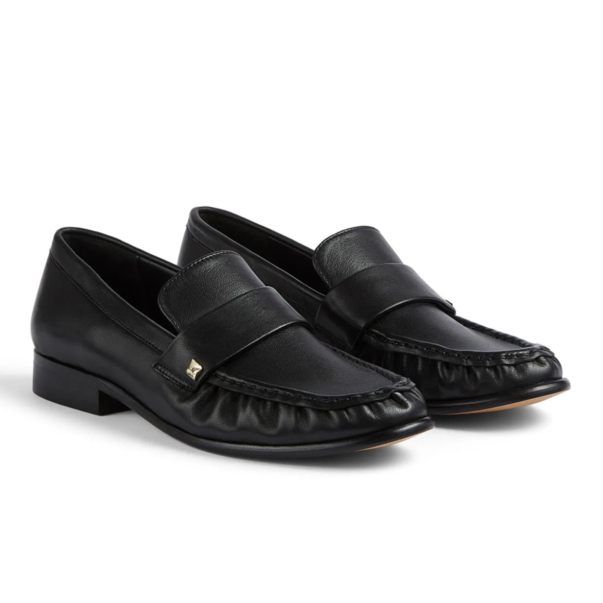 - Round toe, slip-on style, flat sole, tonal stitching, smooth leather finish