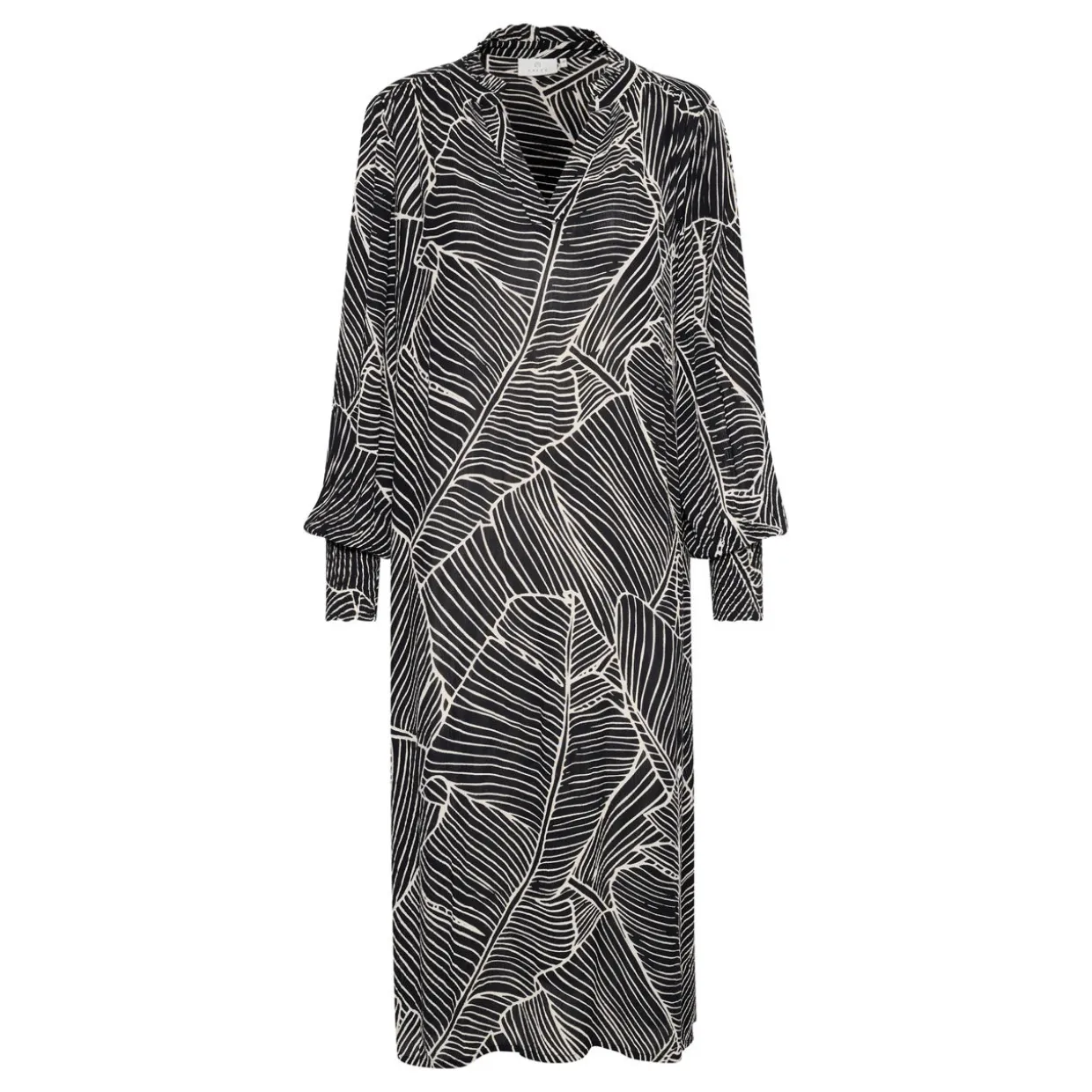 - V-notch neckline, frilled collar, long bishop sleeves, wide smock cuffs, seamed side pockets, split hemline, midi length