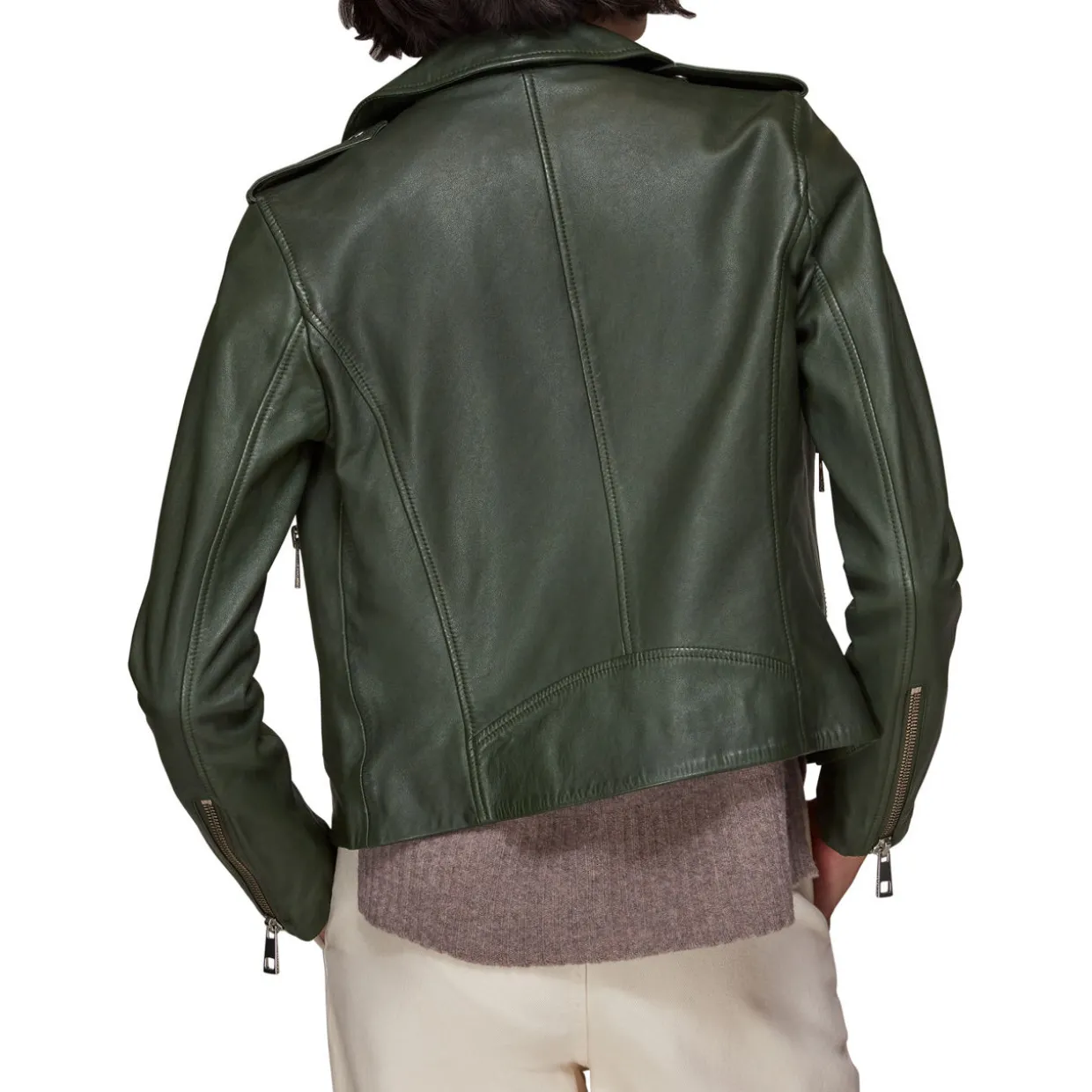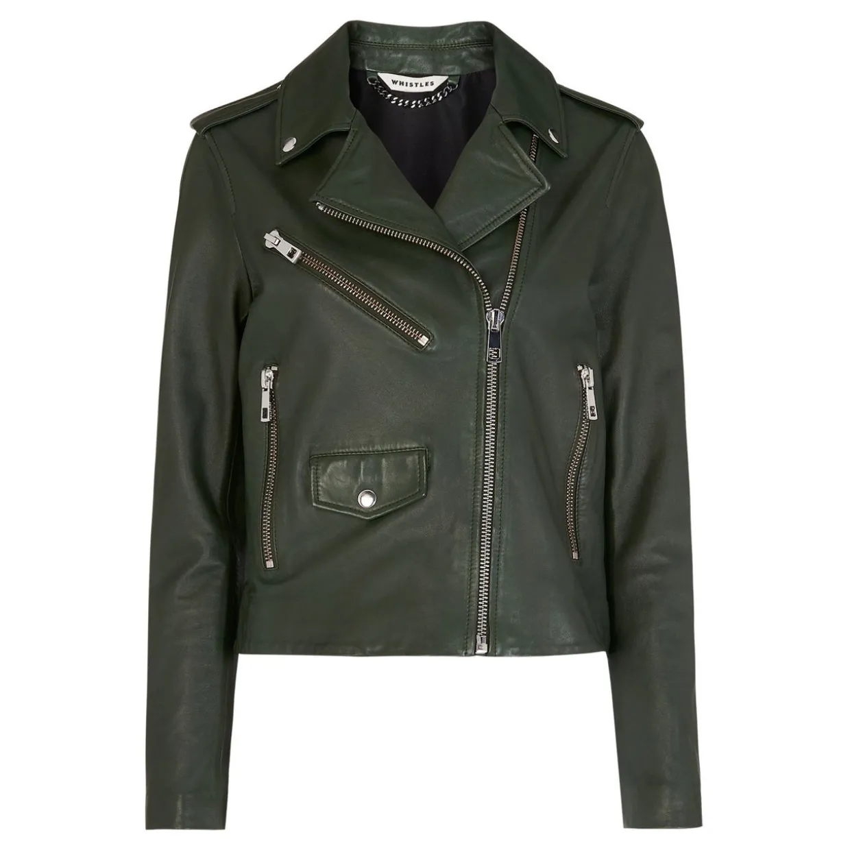 - Biker style, boxy fit, pointed collar, zip fastening, silver tone zip detail.