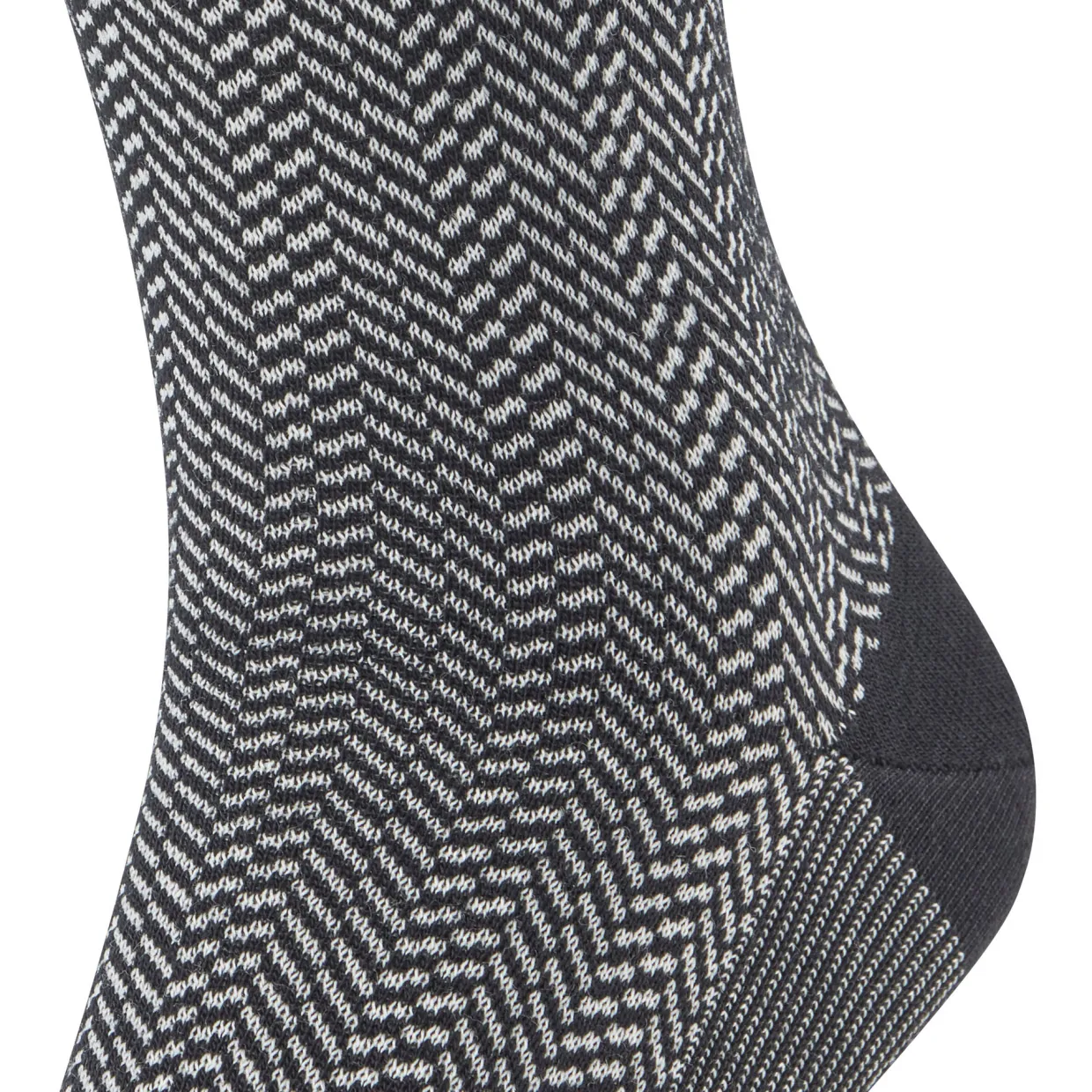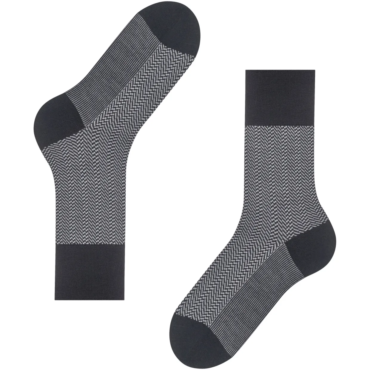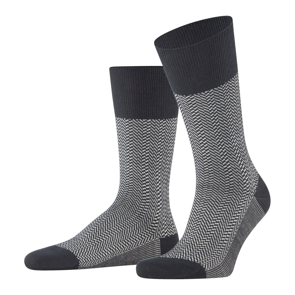 - Soft cotton interior, climate-regulating merino wool exterior, two-tone herringbone pattern, extended cuffs for a wrinkle-free fit, reinforced high-strain zones, durable, Falke Perfect Fit