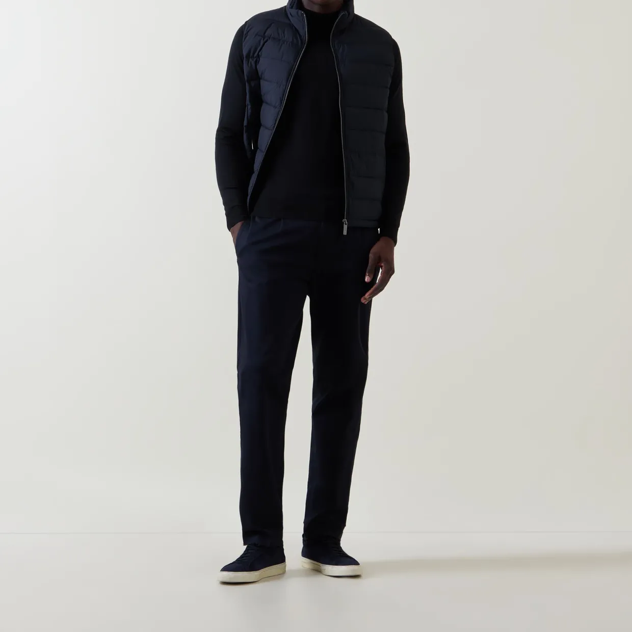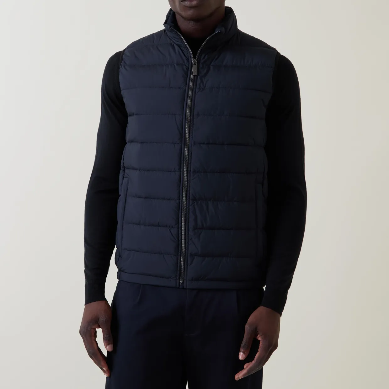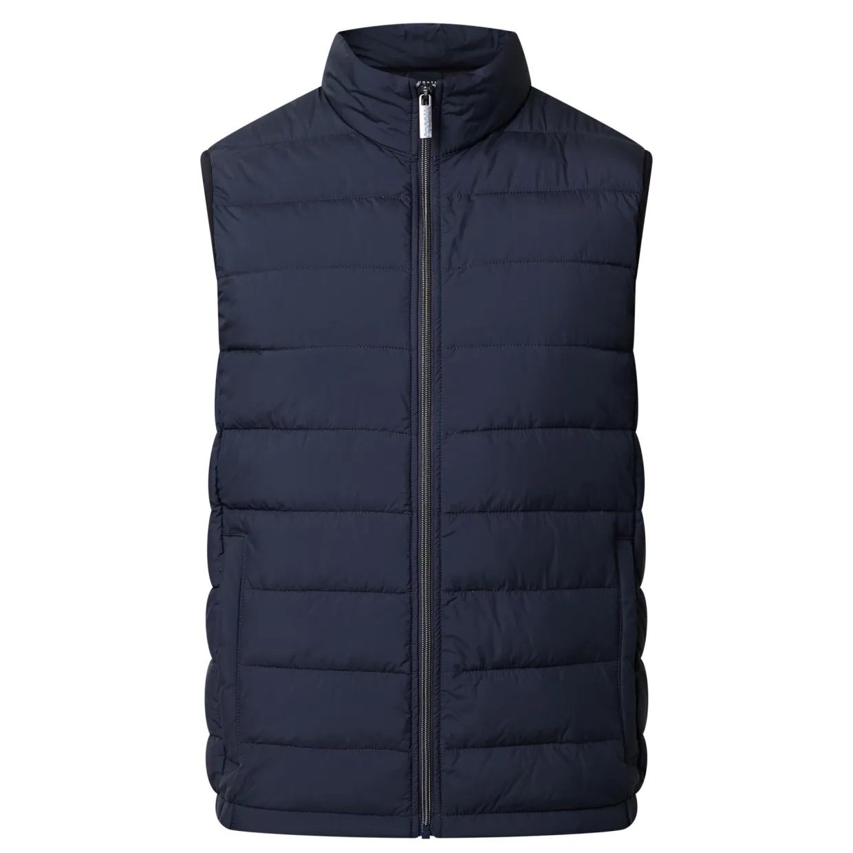 - Stand-up collar, sleeveless, full zip-through fastening, two side zipped pockets, logo badge on back, padded finish