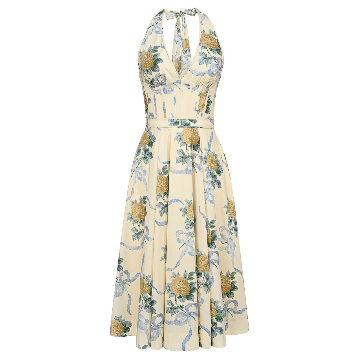 - Stretch cotton fabric, floral print, deep-v neckline, halter neck fastening to the back, bound detailing cinches the waist, zip fastening, side entry pockets