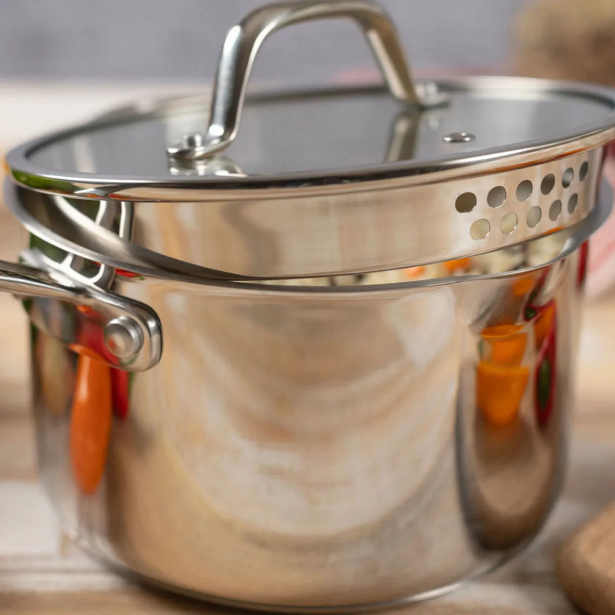 - Available sizes 1.9L/16cm, 2.7L/18cm, 3.7L/20cm, two practical pouring spouts, glass lid with draining function and steam vent, thick encapsulated base stores and spreads heat efficiently, oven safe up to 240°C