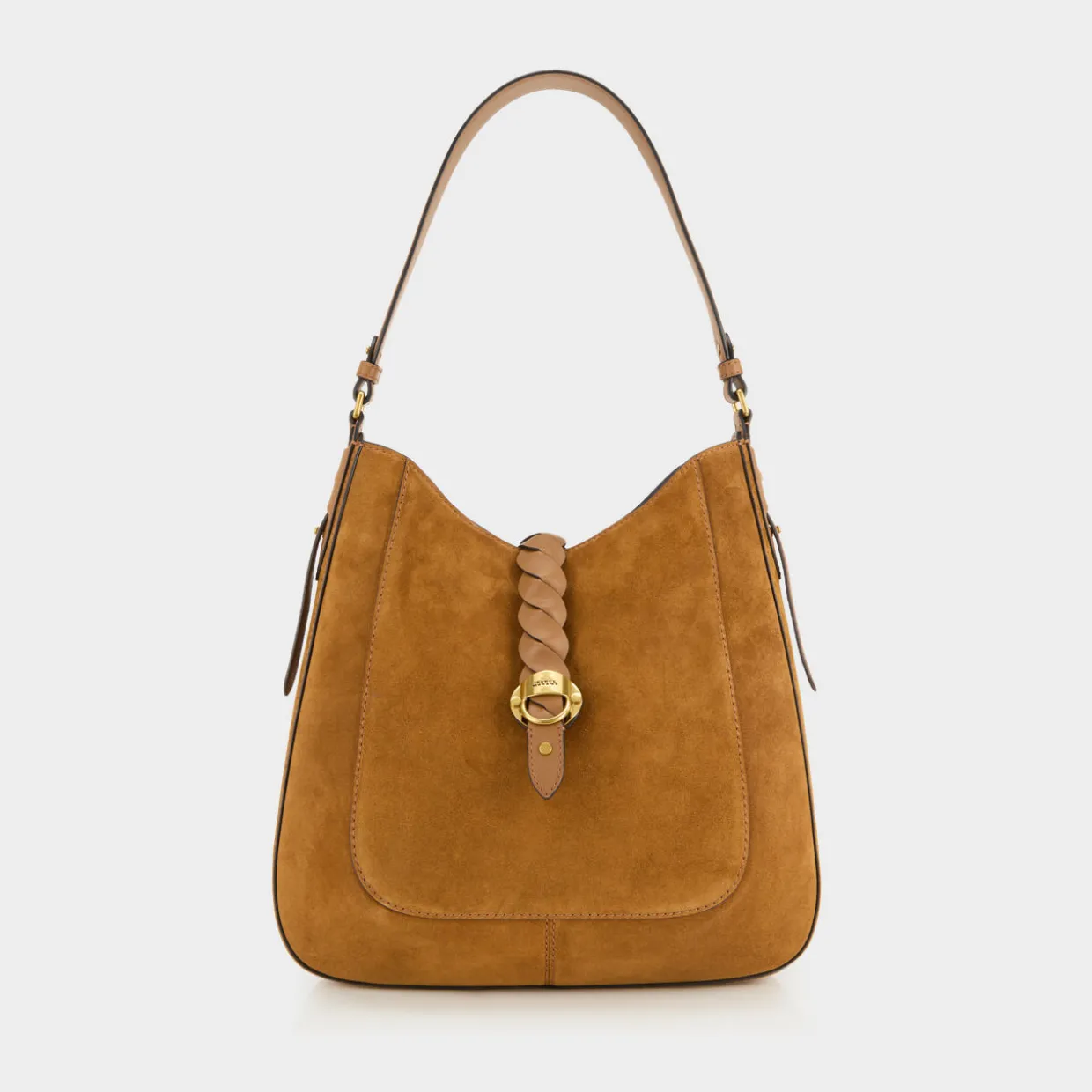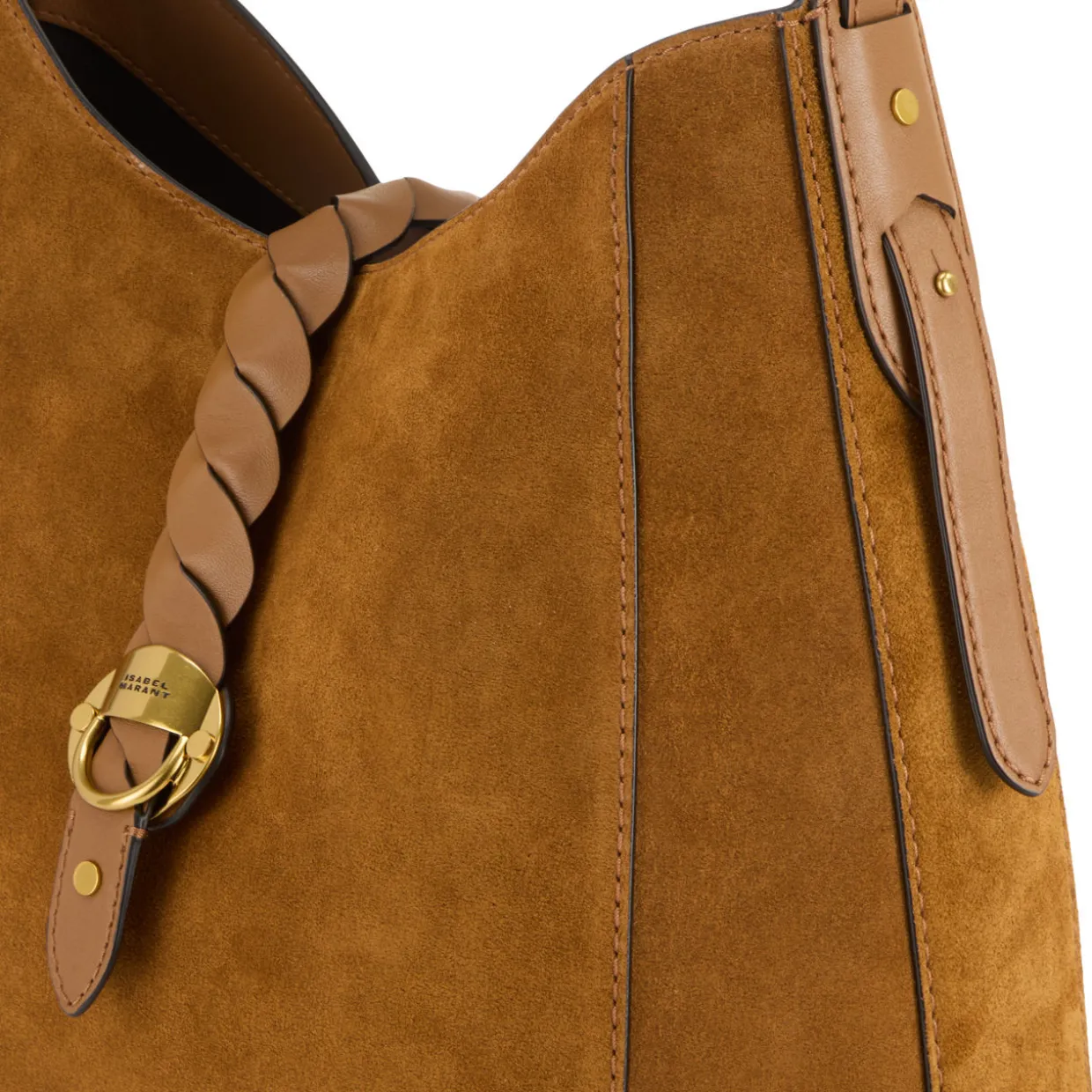 - Soft leather handle, can be carried by hand or on the shoulder, engraved metal rings, braided strap with magnetic fastener, engraved metal plate, embossed ‘Isabel Marant’ logos, gold-tone finish metal details, twill lining, smooth suede finish
