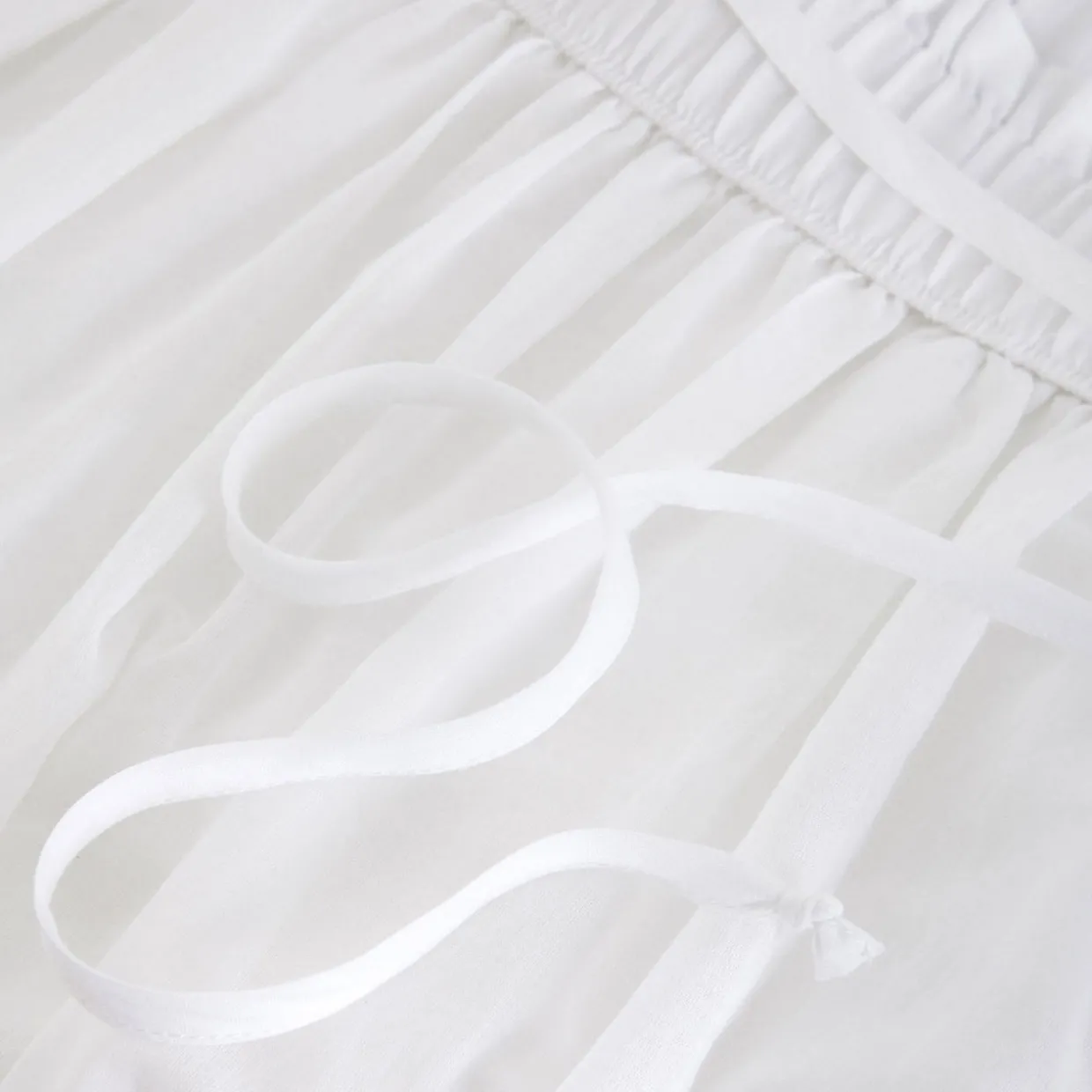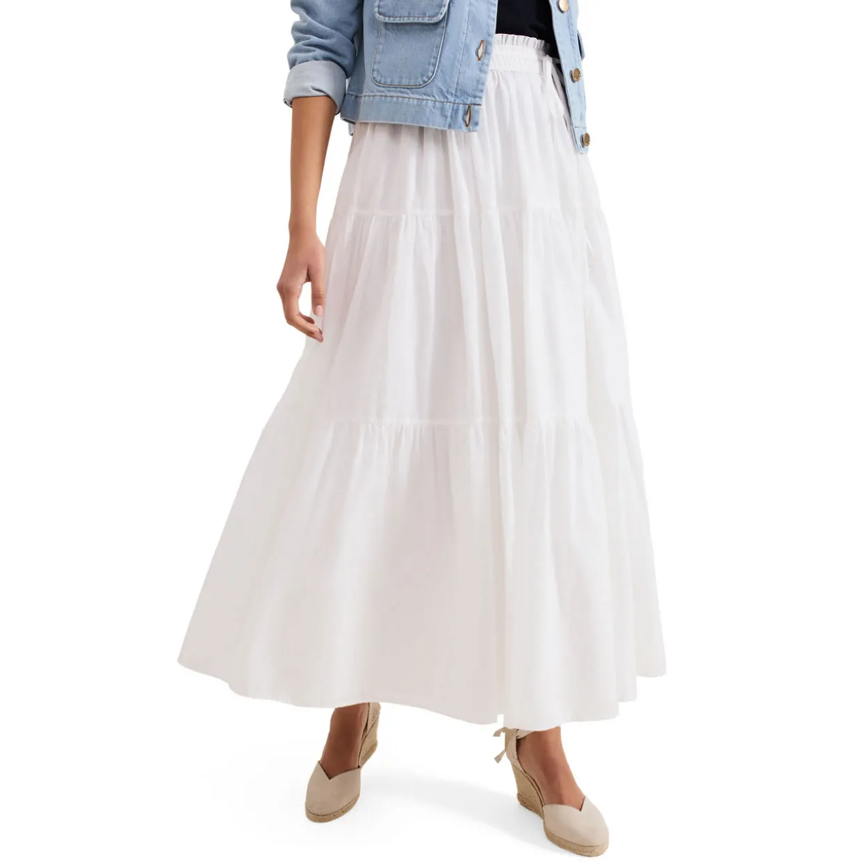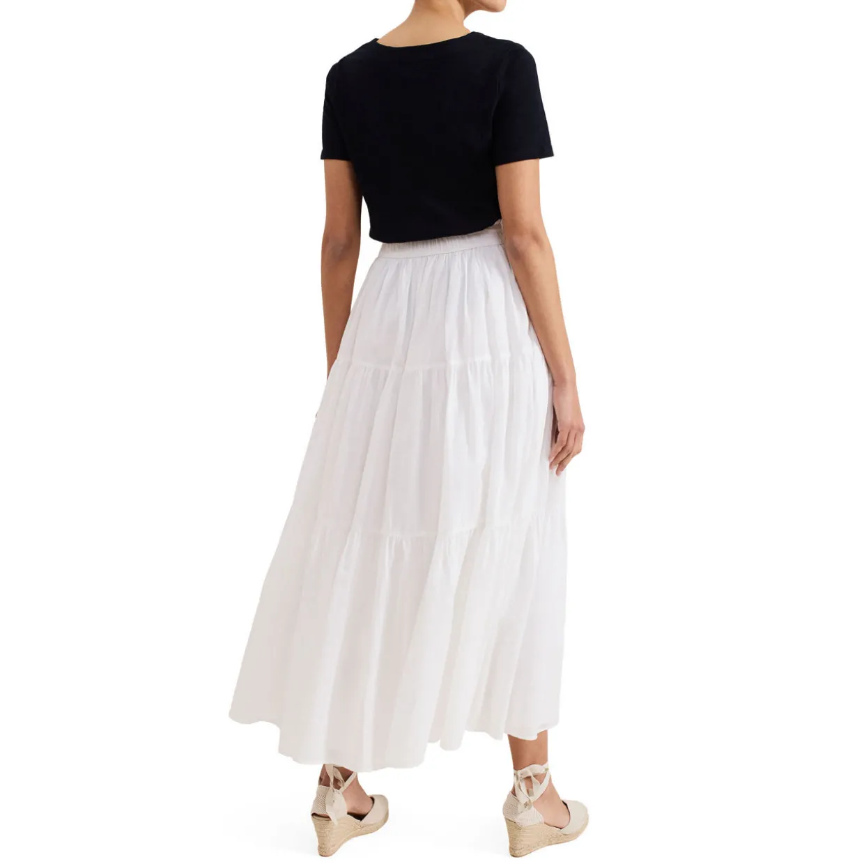 - Full skirt, maxi length, soft ruching, tiered detailing, voluminous silhouette, lightweight style, no fastening