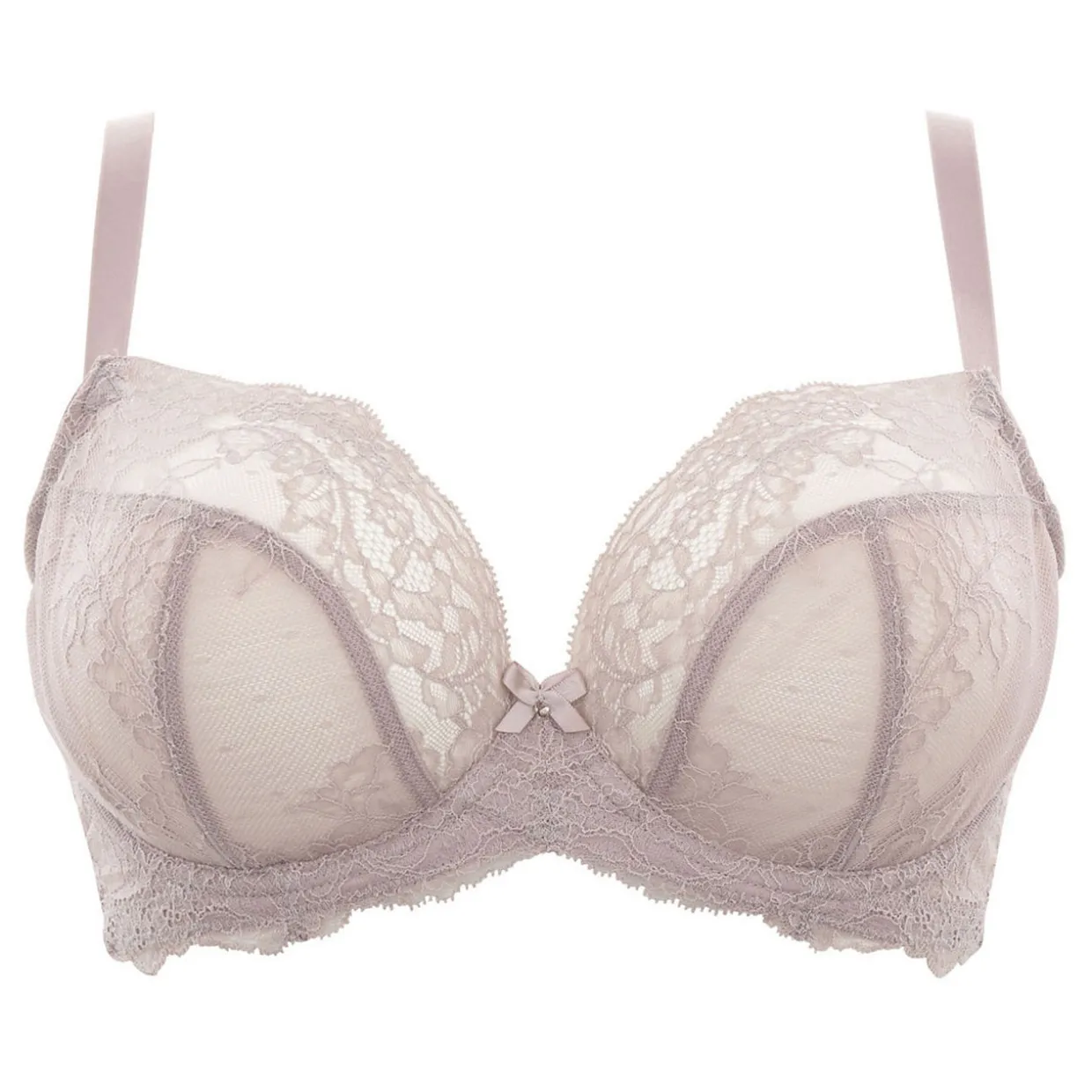 - Adjustable straps, underwired, hook and eye closure, multi-part cups with lace upper panels, scalloped hem, centre bow embellishment