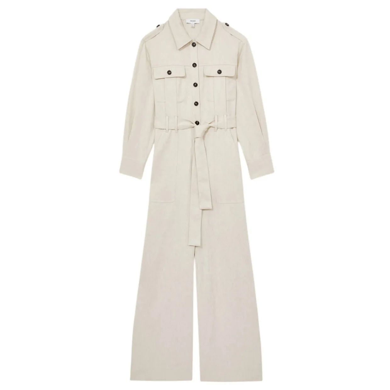 - Wide leg, button epaulettes, button flap chest pockets, long sleeves with pleating, self-tie belt, button cuffs, front buttons