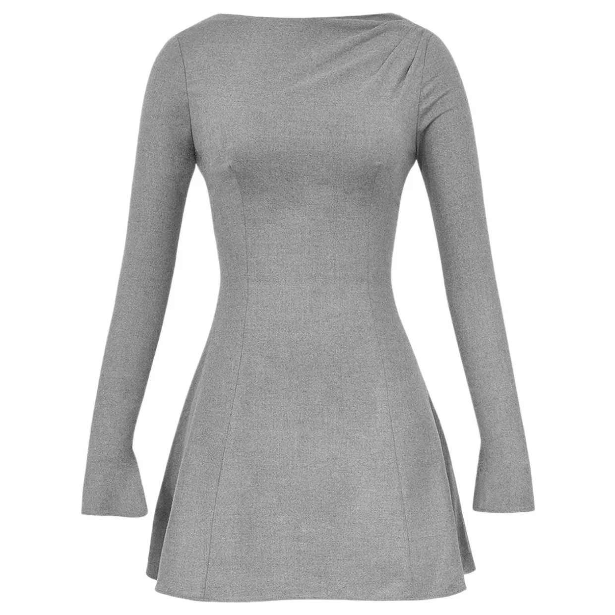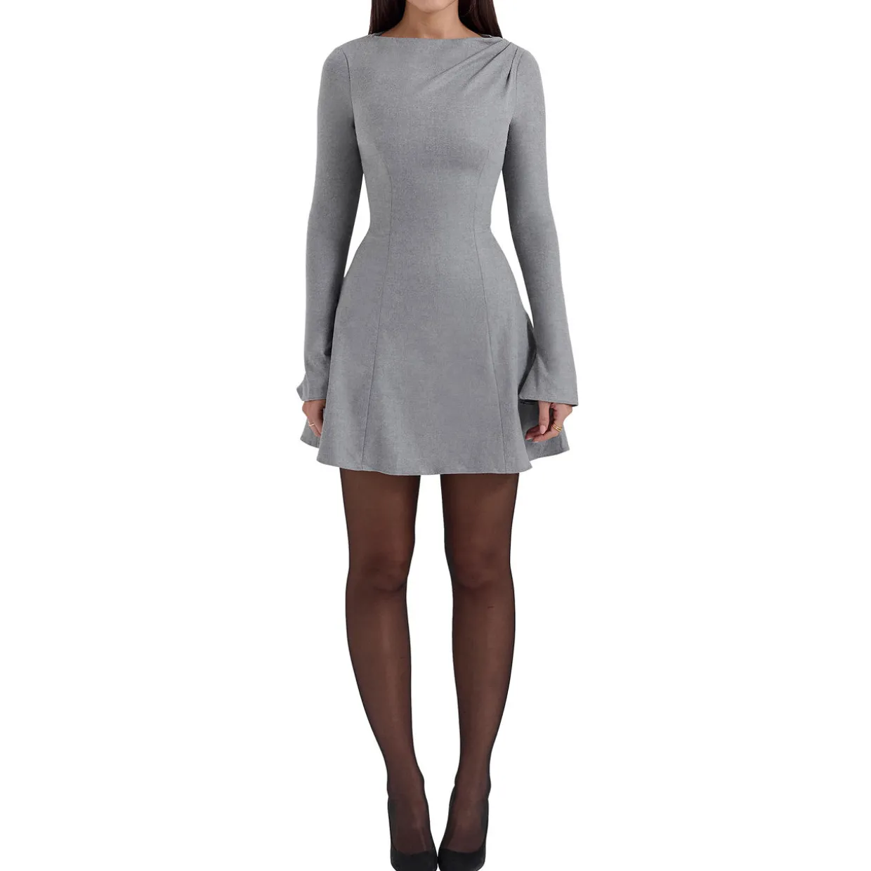 - Boat neckline, flared long sleeves, draped shoulder detail, flared skirt, mini length, zip fastening