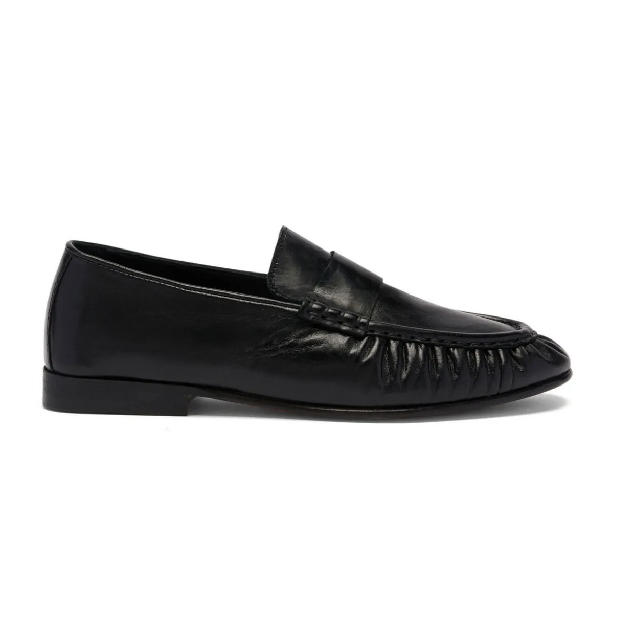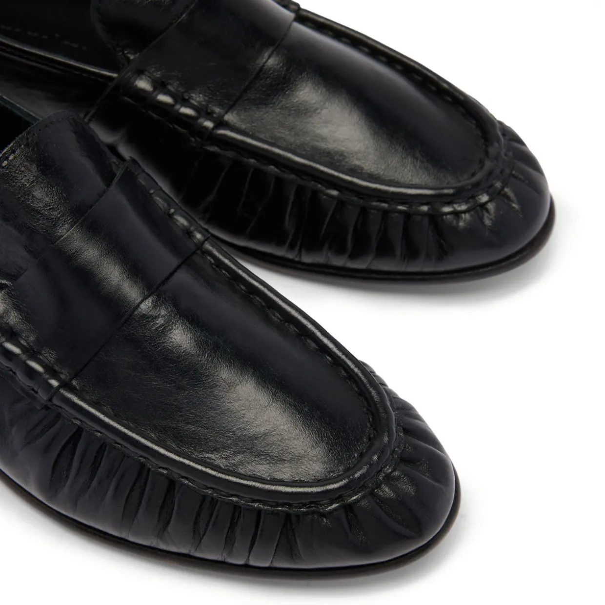 - High-shine leather, ruched stitching, smooth saddle detail, leather sole