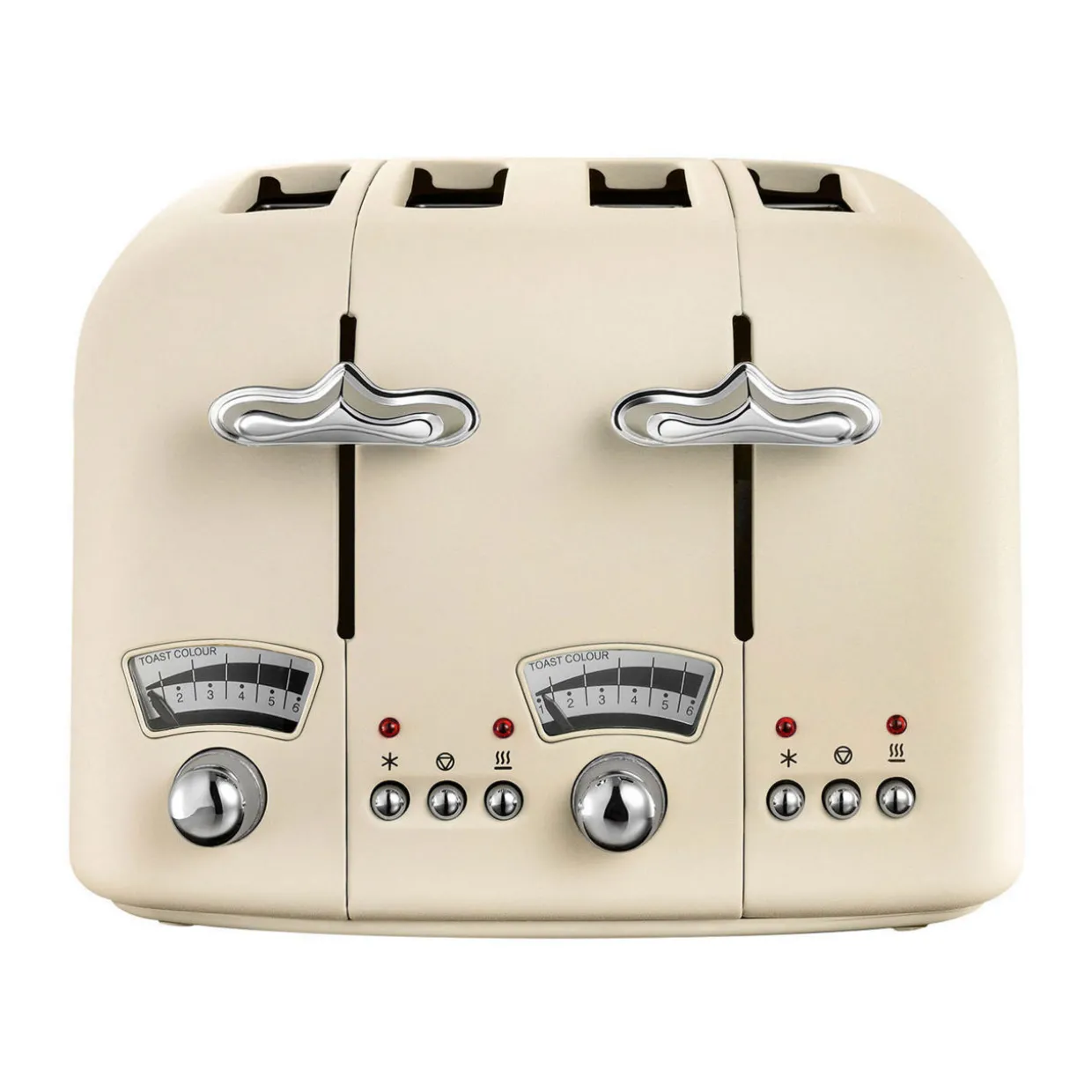 Perfect your morning toast with this Argento Four Slice Toaster from De’Longhi. In soft beige, it offers four slots as well as browning control, variable width slots and a self-centring feature to ensure an even finish. With a frozen bread setting and reheat button, this toaster will cater for the preferences of every family member and all guests. The perfect choice when paired with the matching kettle to add some colour to your kitchen counters.