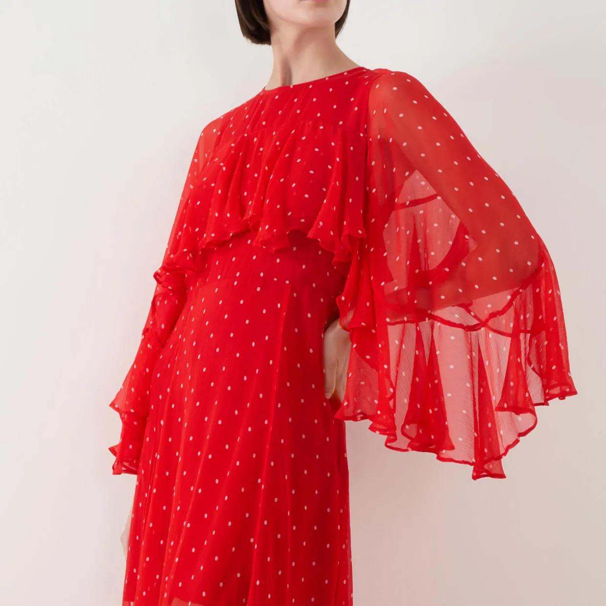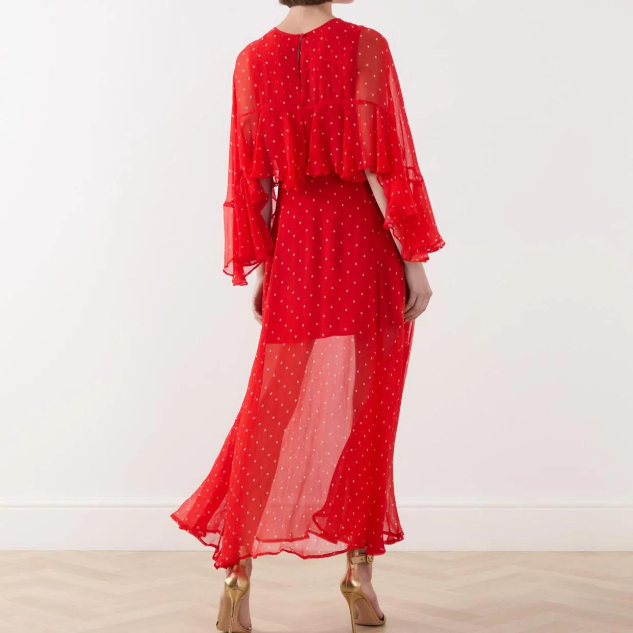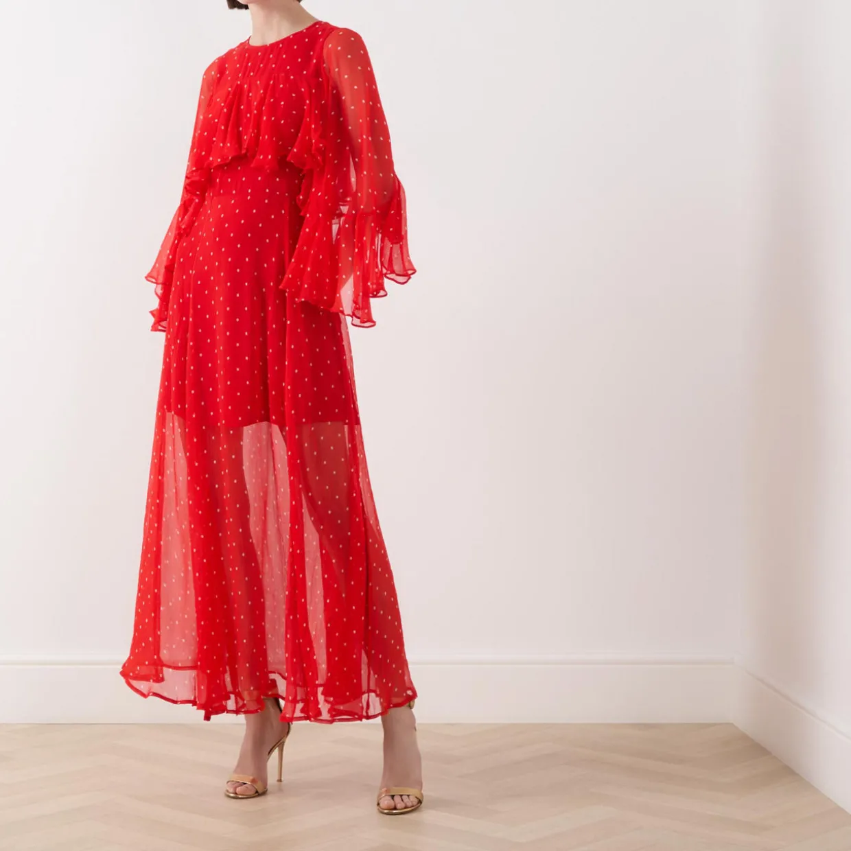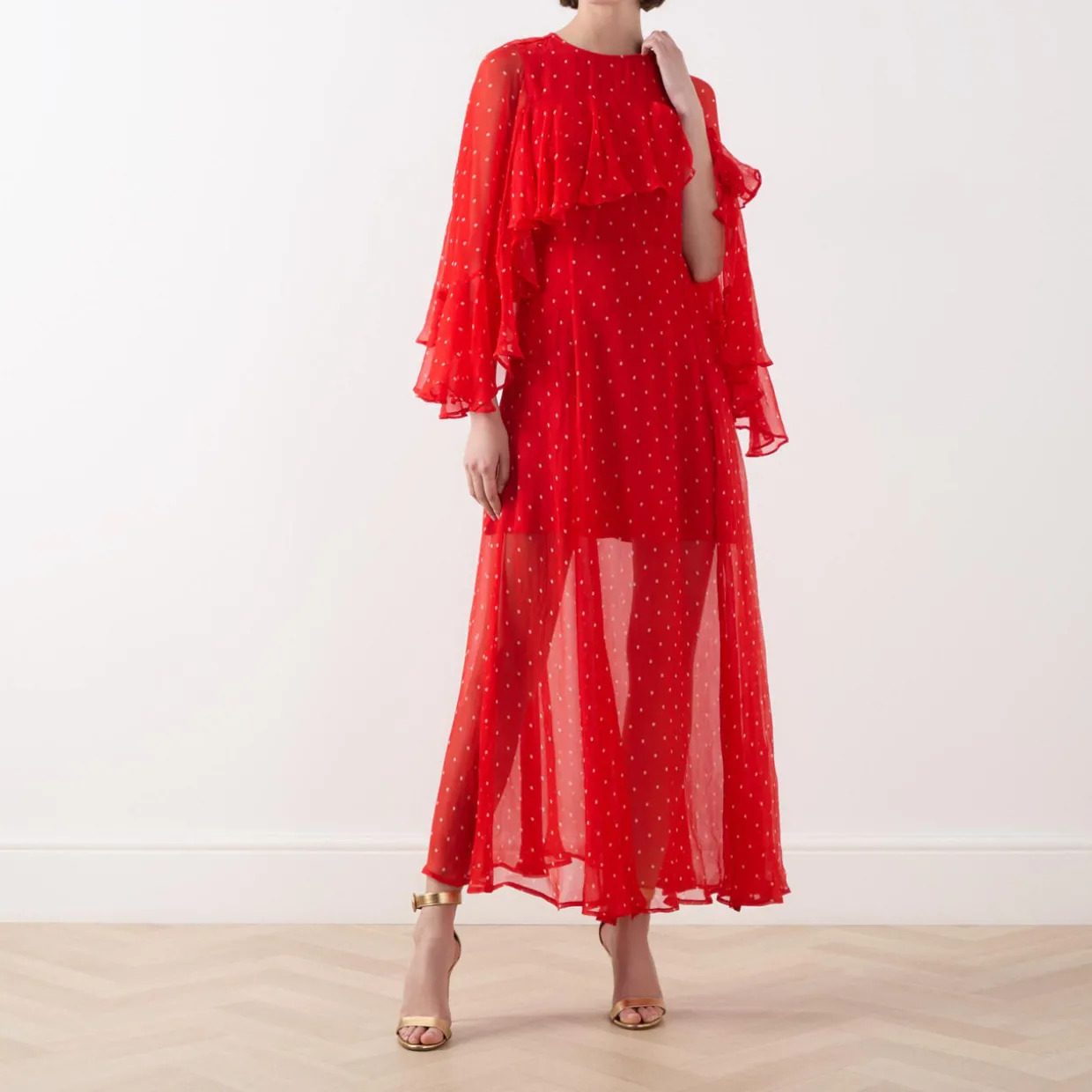 - Round neck, rear keyhole and button fastening, three-quarter length sleeves, ruffle detailing, rear concealed zip closure, half lined, flared skirt, polka dot pattern, semi-sheer finish, maxi length