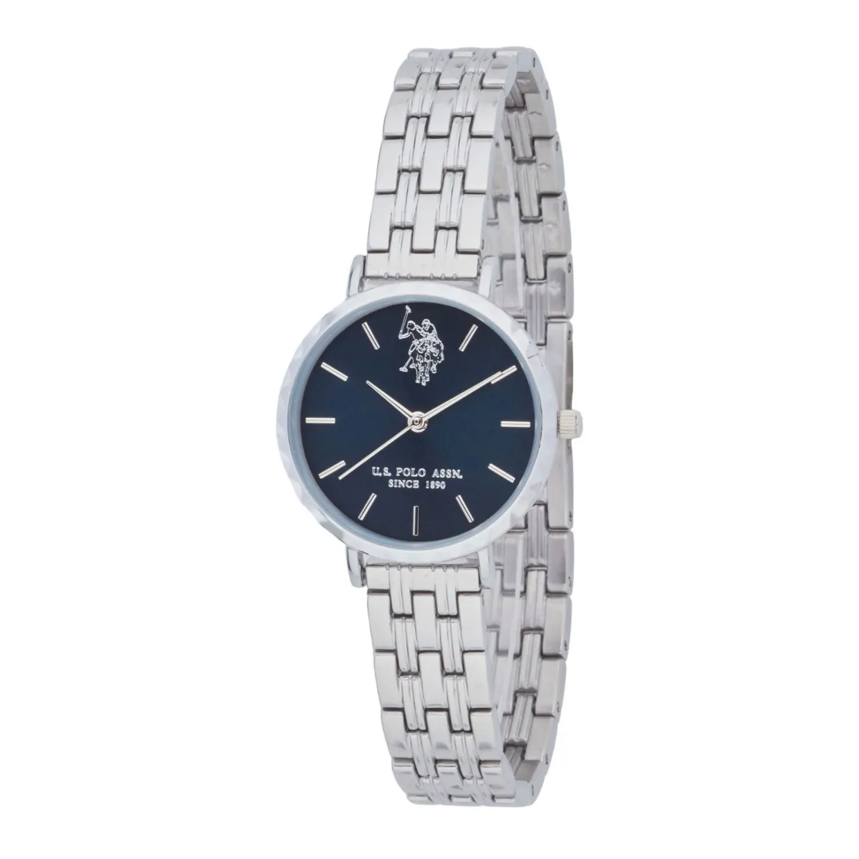 - Silver-tone round case, silver-tone stainless steel link bracelet, blue dial, silver-tone hands and hour markers, brand logo detailing, quartz movement, three hands movement type