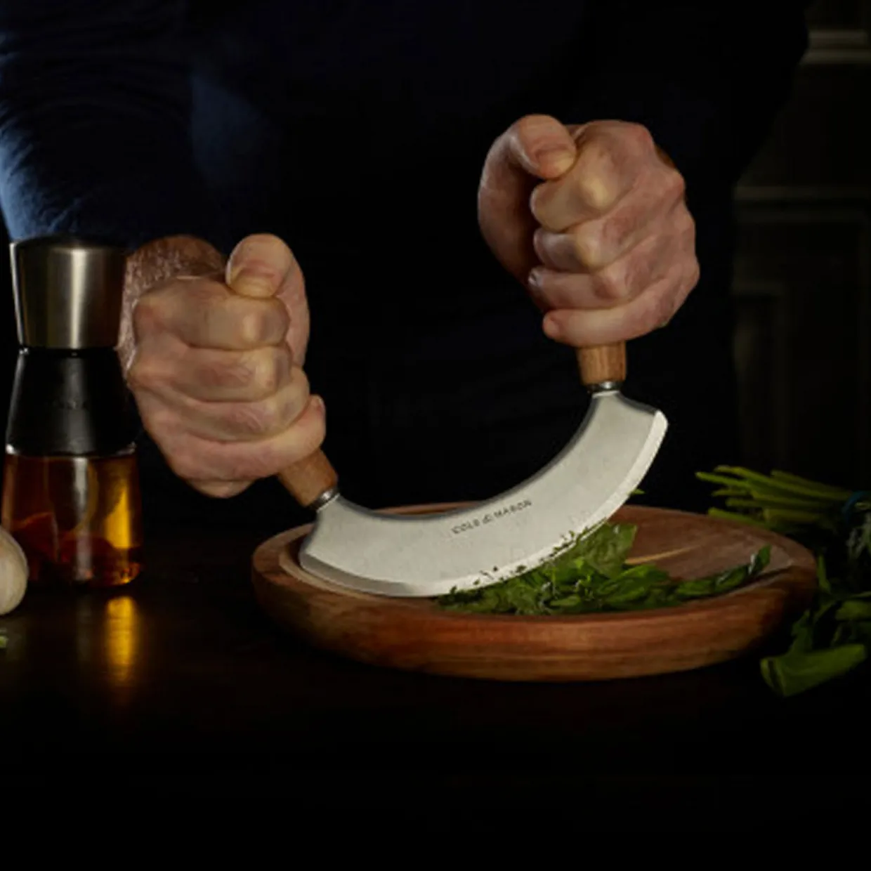 - Two-piece set, super sharp, curved stainless steel blade, mezzaluna knife with two comfortable wooden handles for a superior, smooth chopping motion, one curved board with robust, long-wearing chopping surface, supremely durable