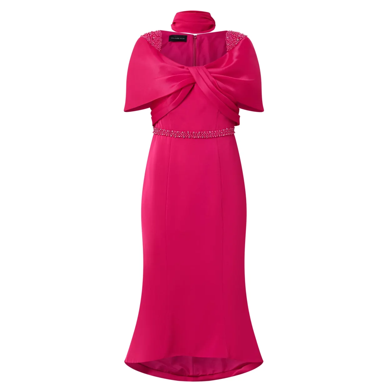 - Scoop neckline, short sleeves, neck tie, twisted design, pleated bust, embellished detailing at the shoulders and around the waist, rear zip fastening, flared high-low hem, midi length, smooth finish