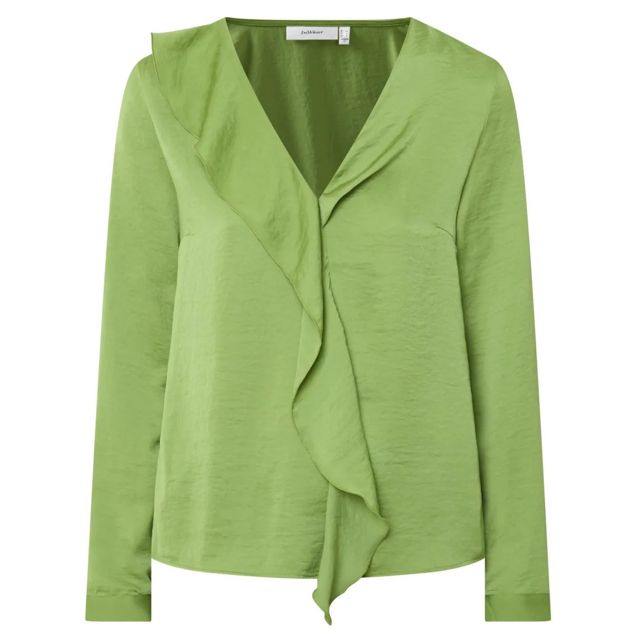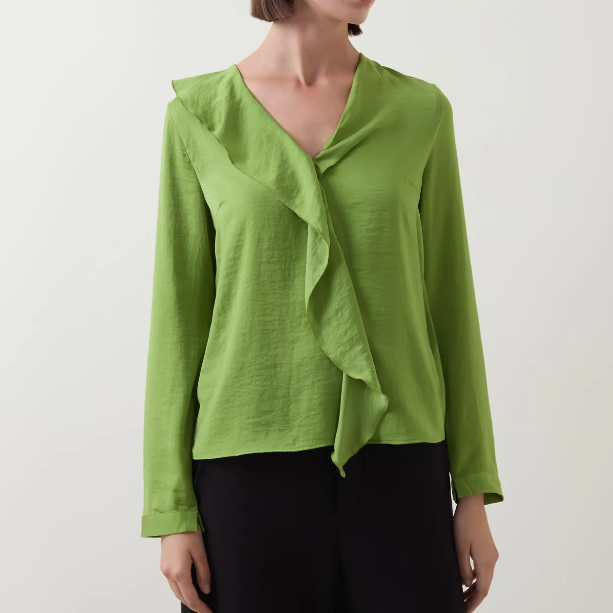 - V-neckline, asymmetrical ruffle across the front, long sleeves, curved hemline, slit in cuffs