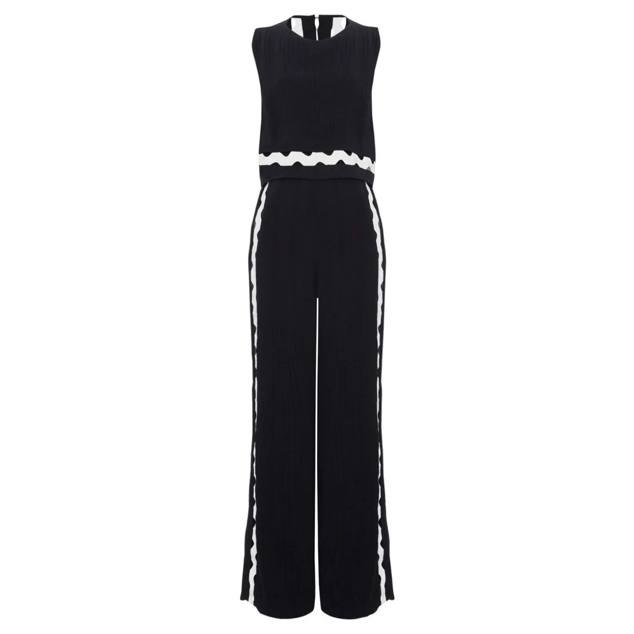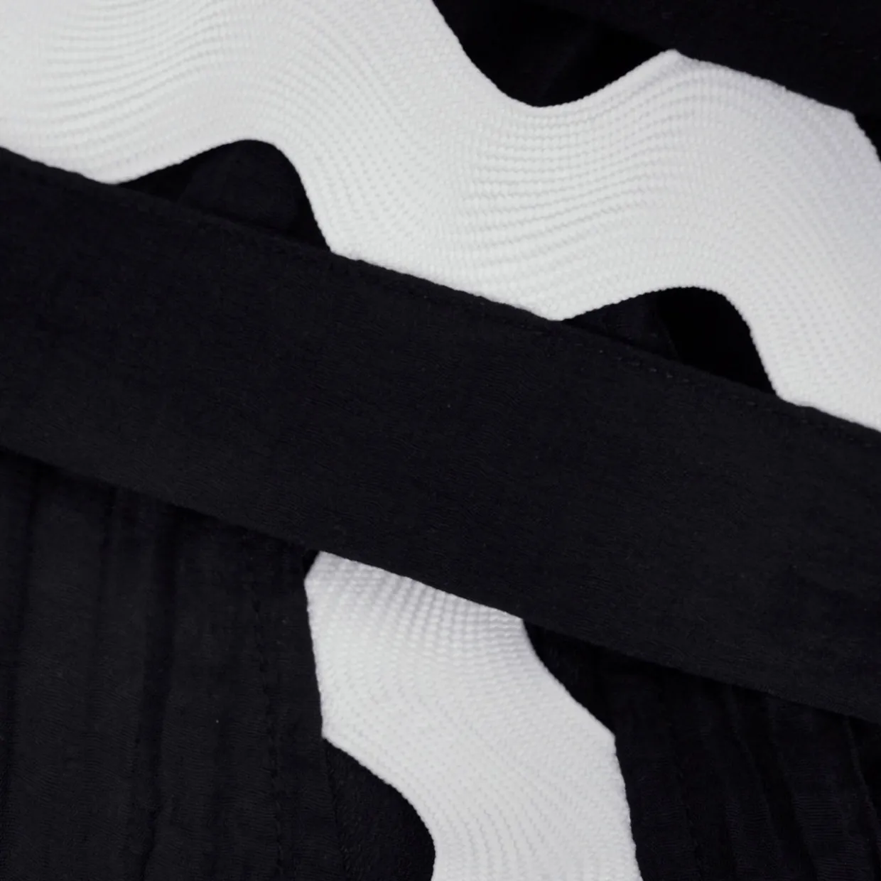 - Contrasting cutwork detailing, subtle pleating throughout, wide-leg silhouette, button fastening