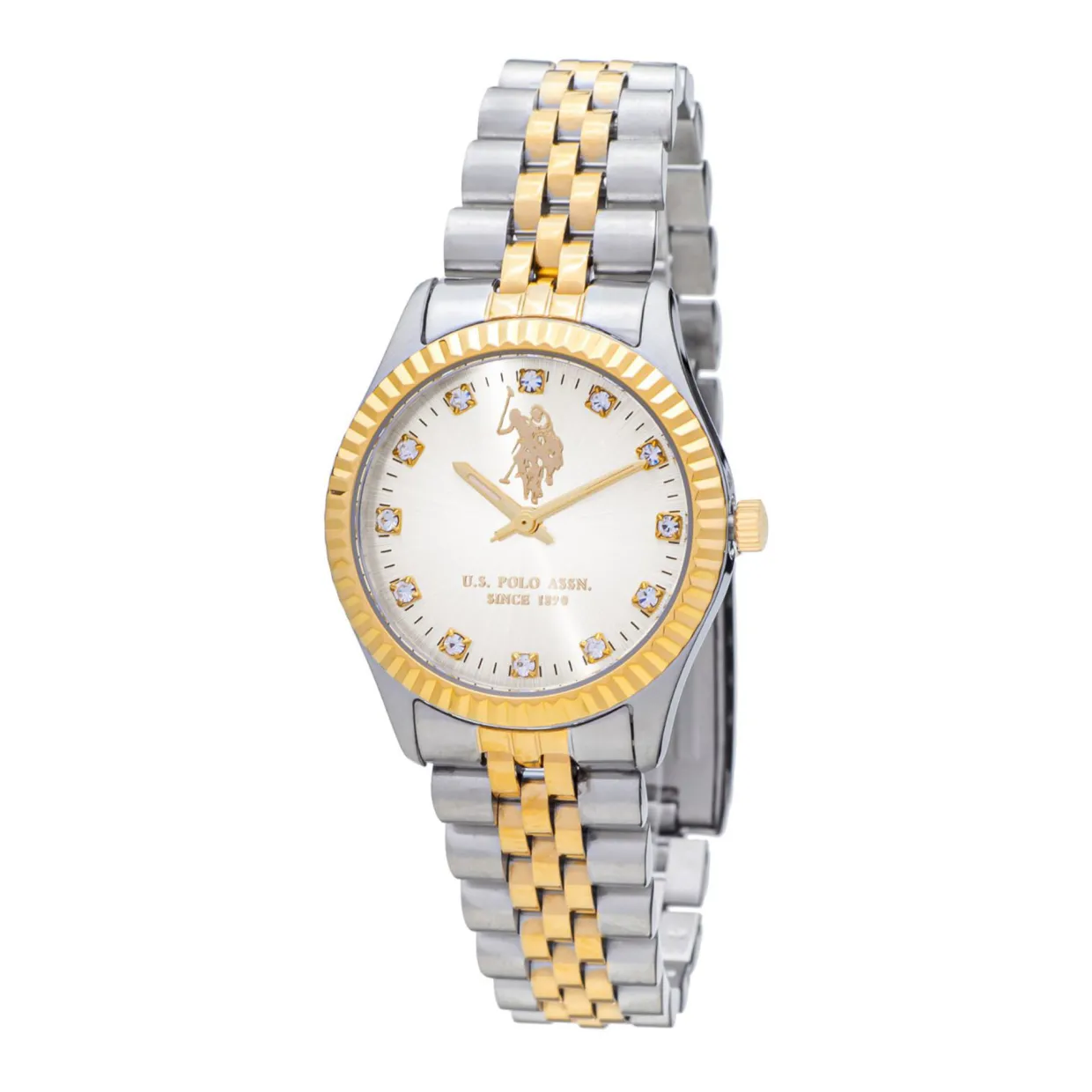 - Two-tone design, stainless steel case and bracelet, white dial, crystal markers, gold-tone hands, brand logo detailing, bezel with crystal embellishment, quartz movement, three hands movement type, round case