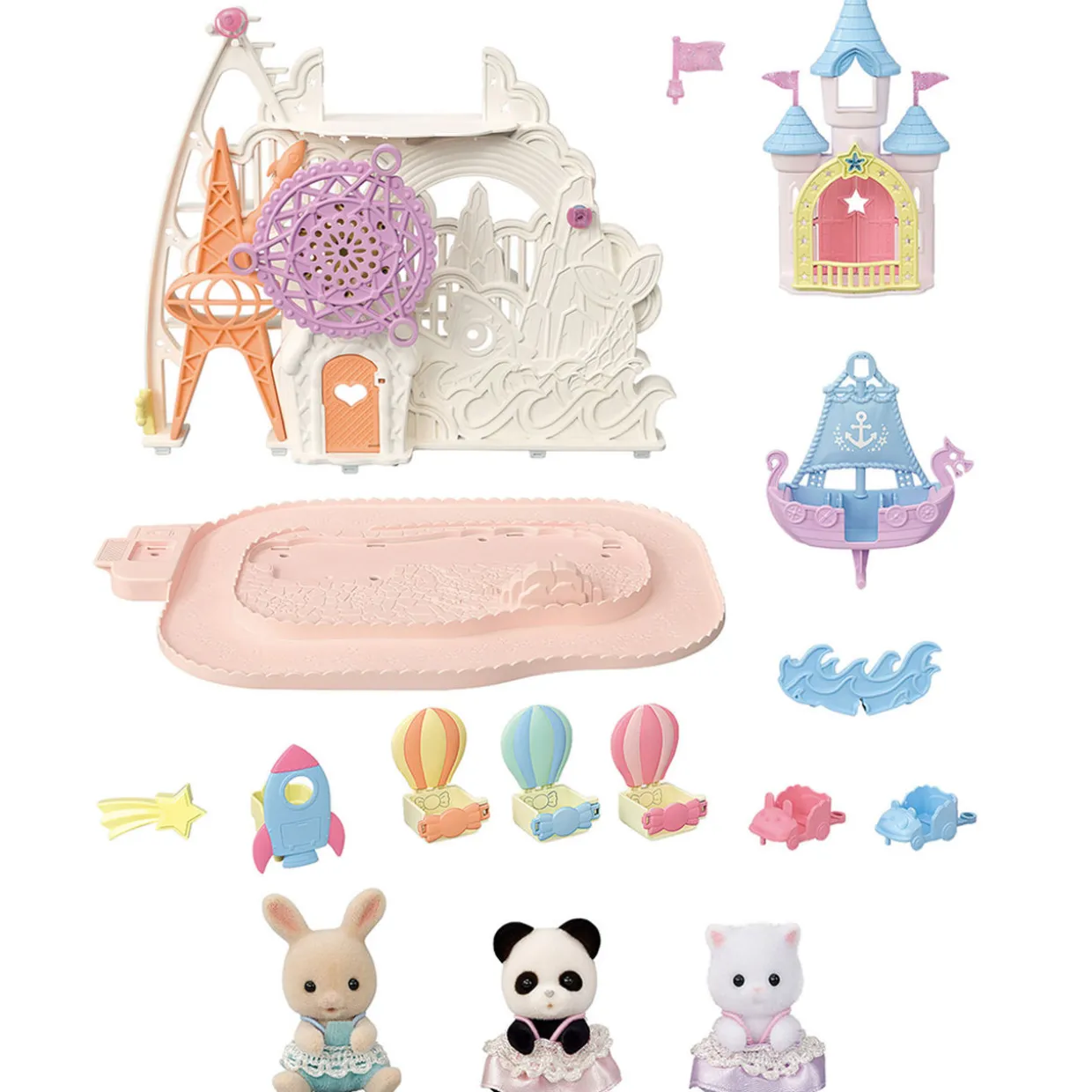- 12 pieces total, amusement park theme, castle, Ferris wheel, Viking ship, go-karts, rocket ride, ‘Pookie Panda’ baby, ‘Milk Rabbit’ baby, ‘Persian Cat’ baby