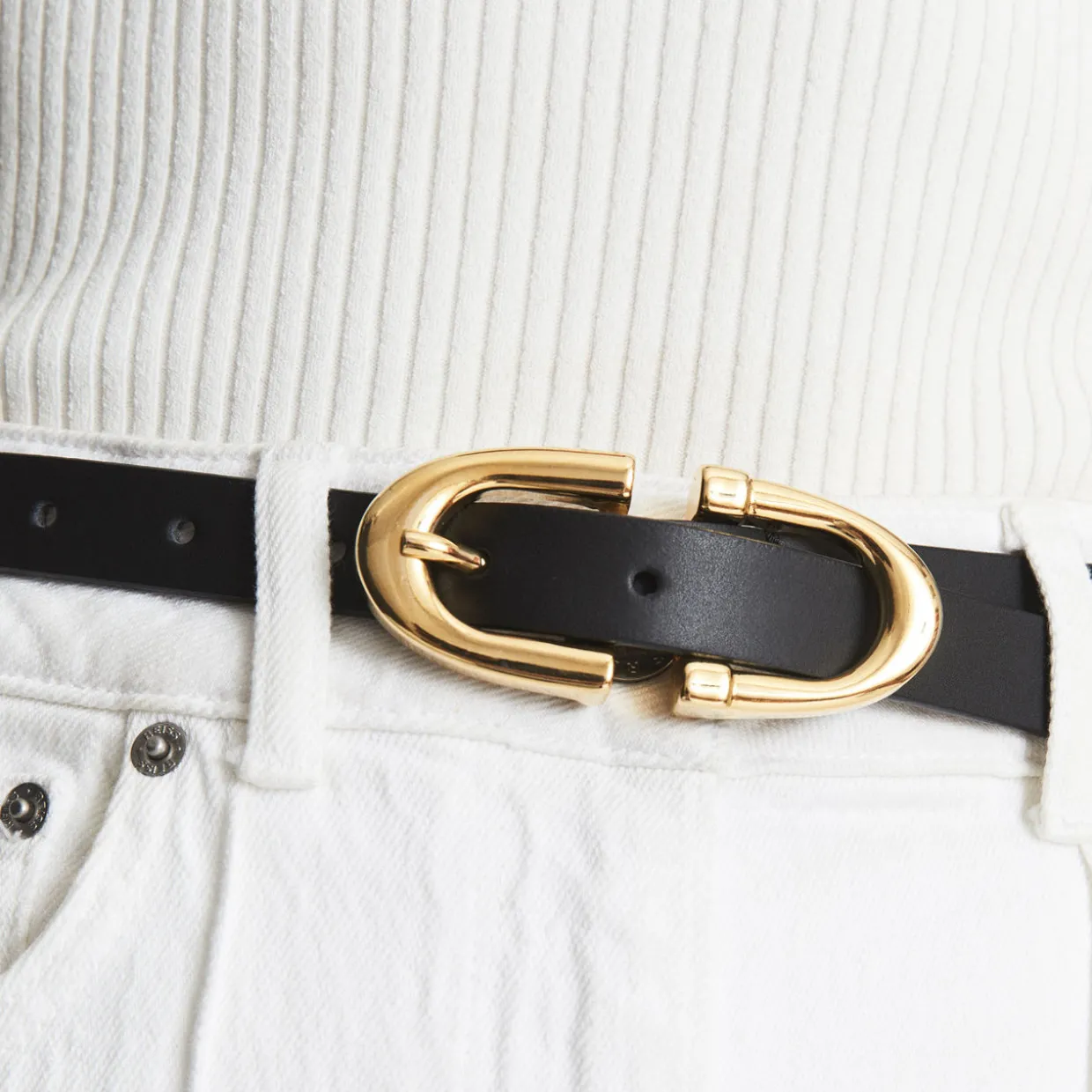 - Double horseshoe-shaped buckle, gold-tone hardware, adjustable, smooth leather finish