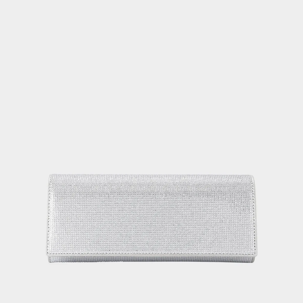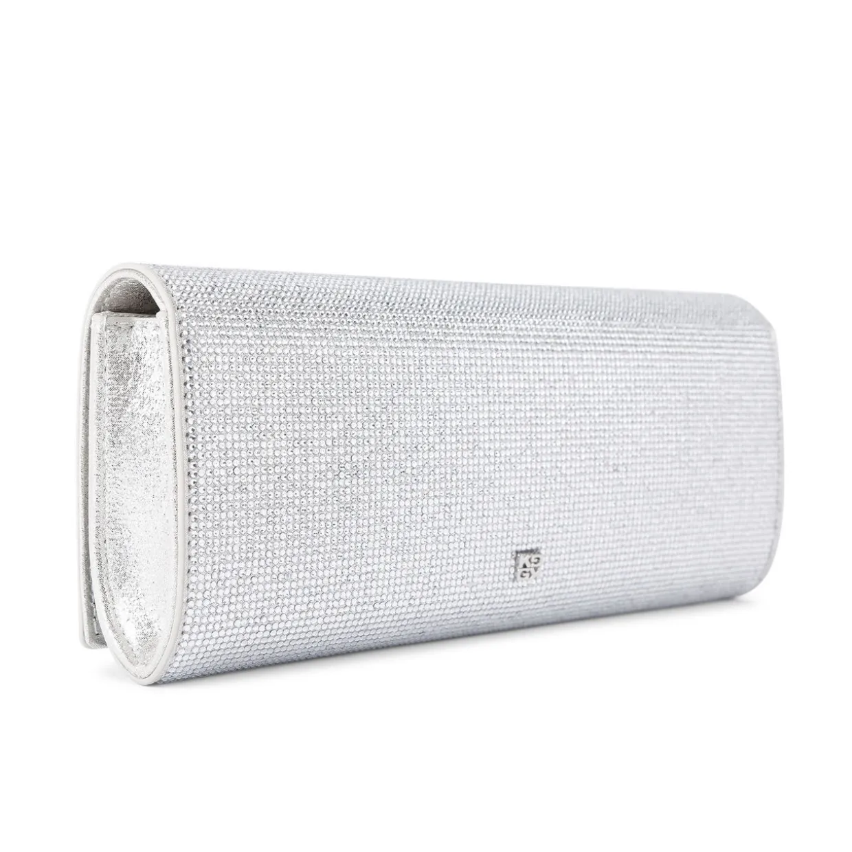 - Crystal embellishment, silver-tone hardware, chain strap, brand logo stud, fold-over flap, snap fastening, lined, can fit phones up to 7-inches