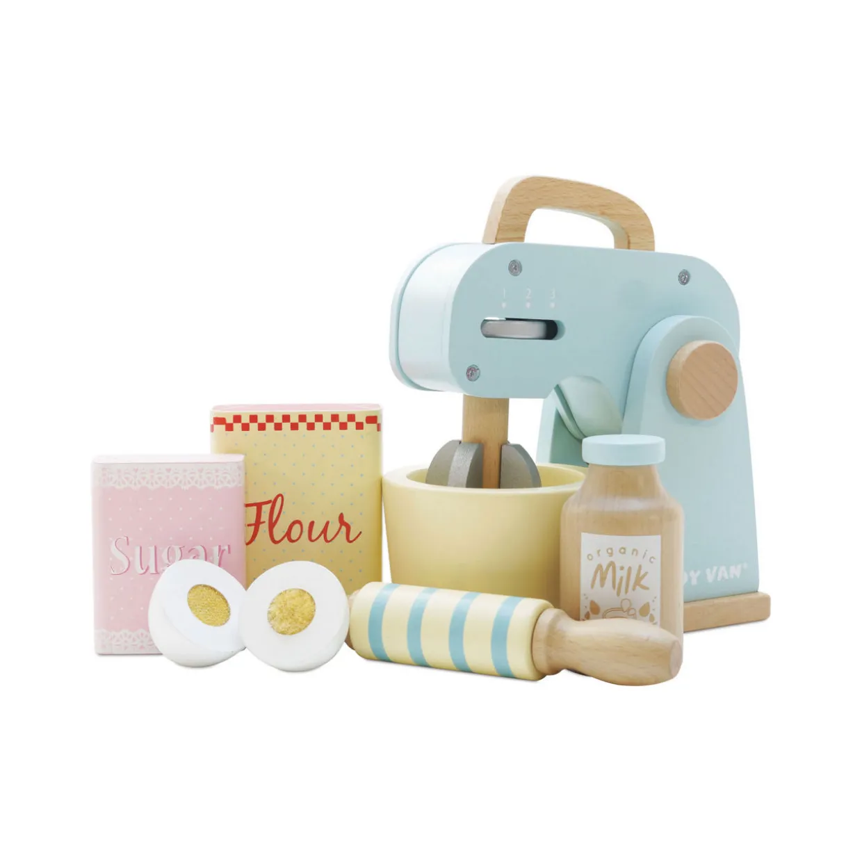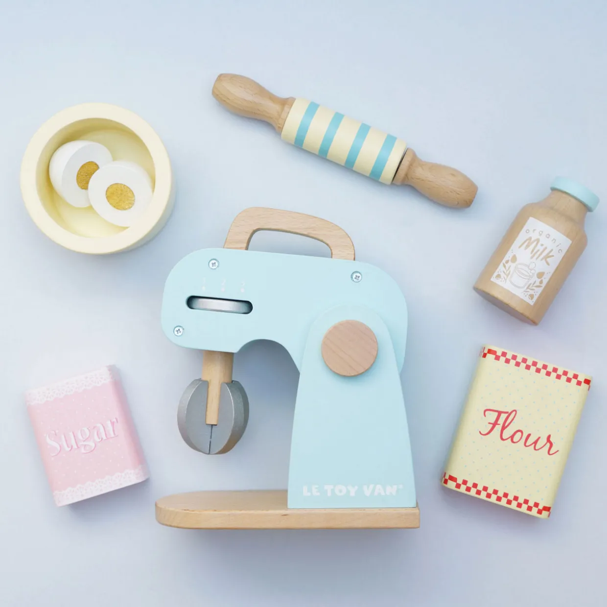 - Role play home baking set, 1x wooden moving mixer, 1 x wooden rolling pin, 1x wooden egg, 1 x wooden sugar packet, 1 x wooden milk bottle