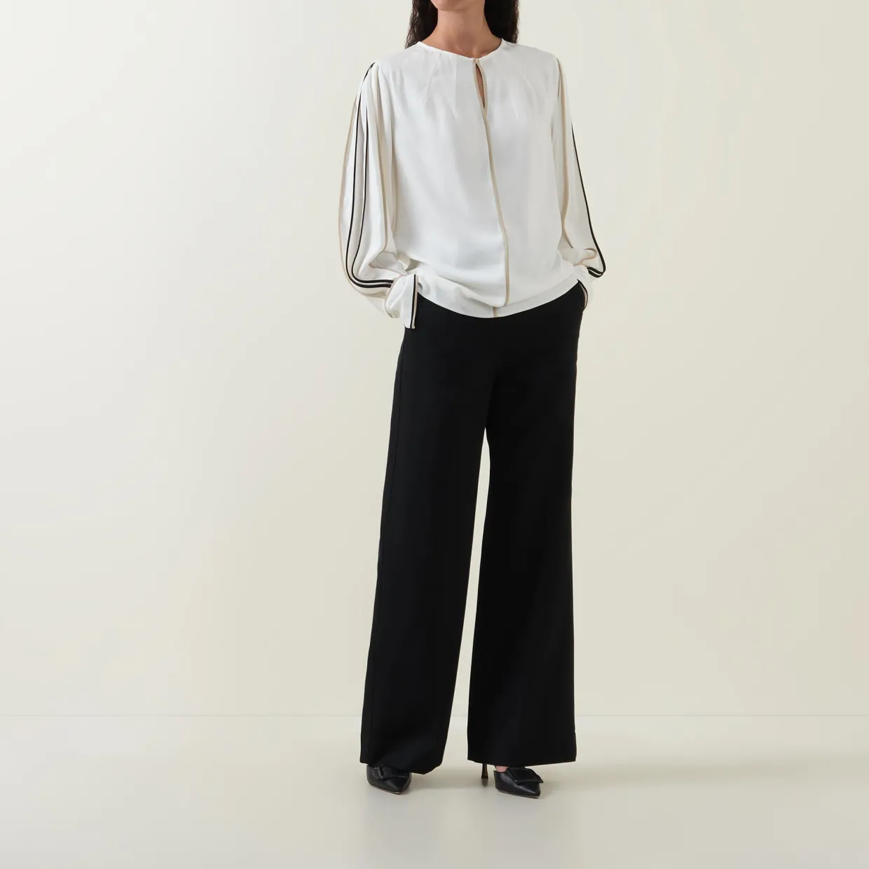 - Round neckline, long blouson sleeves with logo stripe detailing, front keyhole detail, tonal stitching, smooth fabric