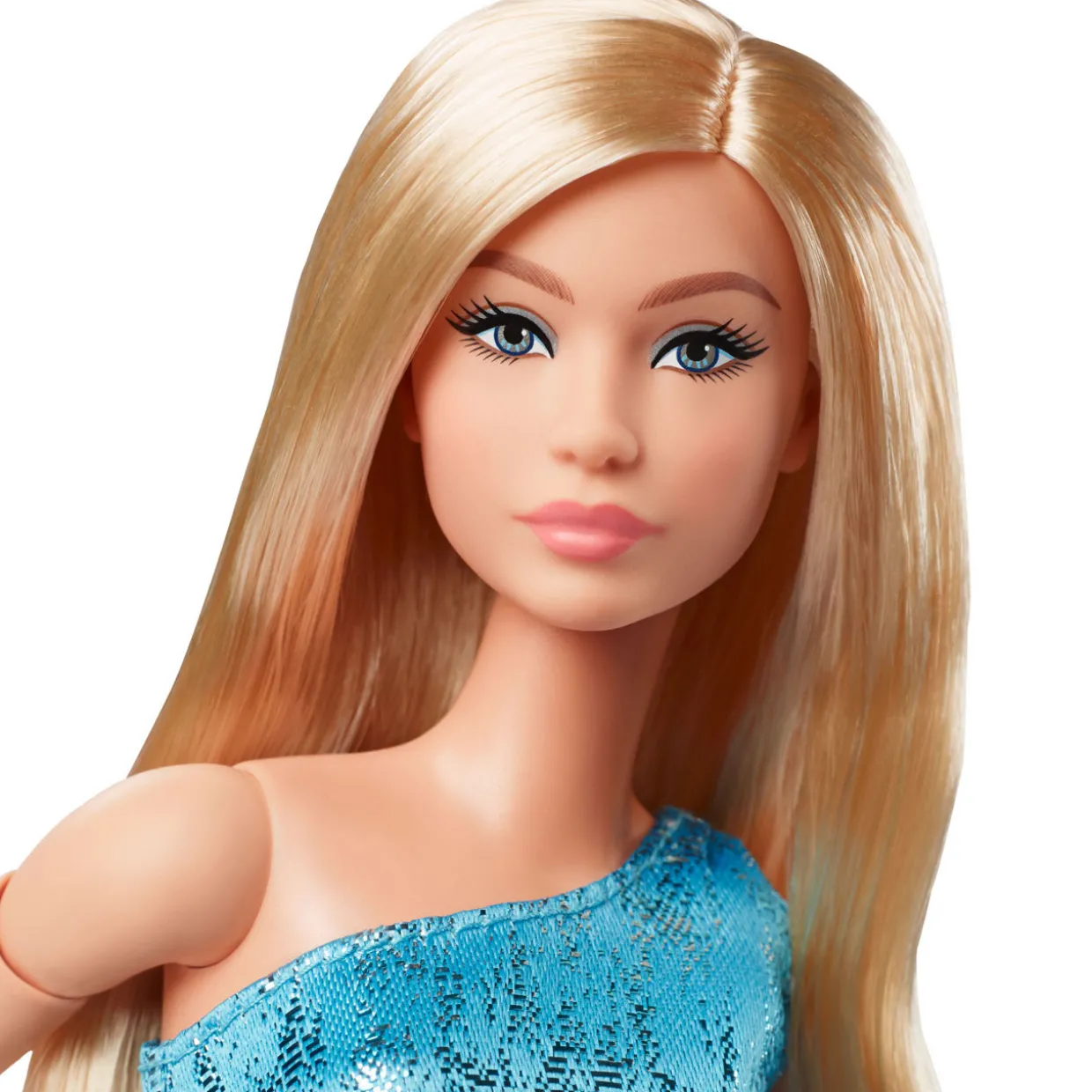 - Barbie Looks No.23 collectible doll, ‘Made To Move’ body, doll stand, ‘Certificate of Authenticity’, one-shoulder blue dress with metallic jacquard print, strappy heels