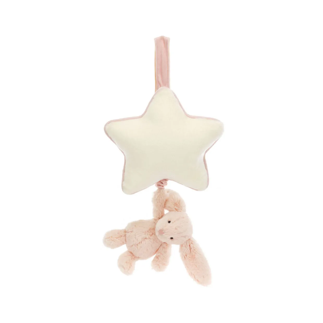 An enchanting newborn gift, let babies dream sweetly with a Bashful Blush Bunny Musical Pull from Jellycat. Featuring the brand’s most loved Bashful Bunny, gently pull to hear an original Jellycat lullaby. The cream star shaped musical pull with contrast trim can be attached to a crib or pram using the hook and loop fastening.